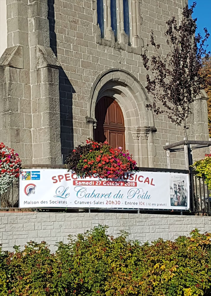 Création & Installation de banderoles permettant d’annoncer l’organisation d’un spectacle sur la commune de Cranves-Sales. Décor réalisé par nos soins.