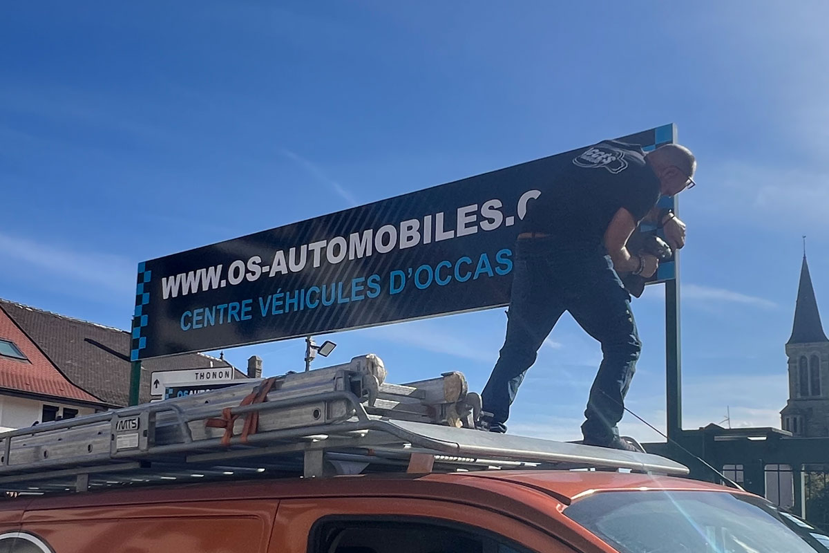 Création et installation de panneaux en Alu Dibond, accompagnée de la mise à jour de l’enseigne lumineuse pour un vendeur de véhicules d’occasion situé à Bons-en-Chablais. La création graphique a été réalisée par notre partenaire OAK-Webdesign.