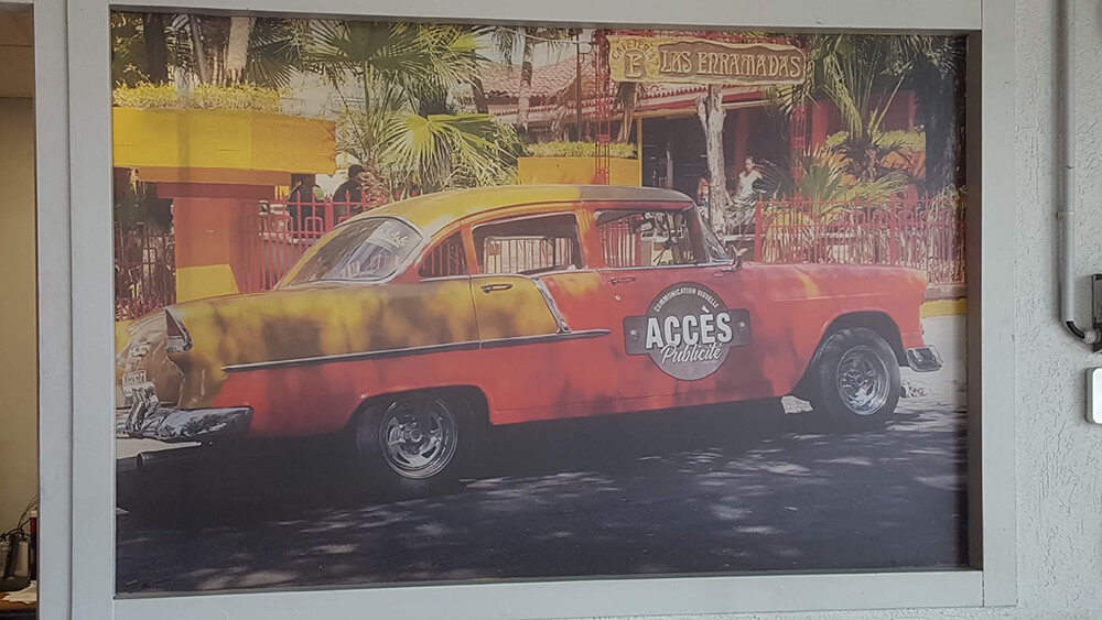 Création et installation d’une déco originale en adhésif dépoli diffusant afin de personnaliser la vitre de notre atelier graphique sans obstruer la lumière. Tous nos adhésifs sont imprimés et préparés sur place afin de s’adapter à toutes les dimensions.