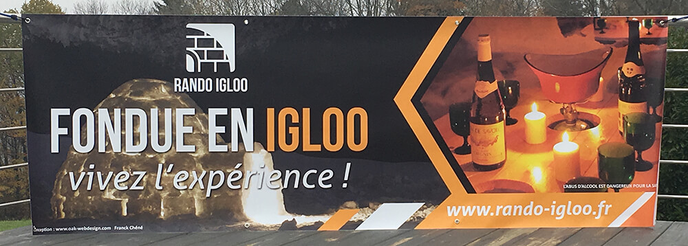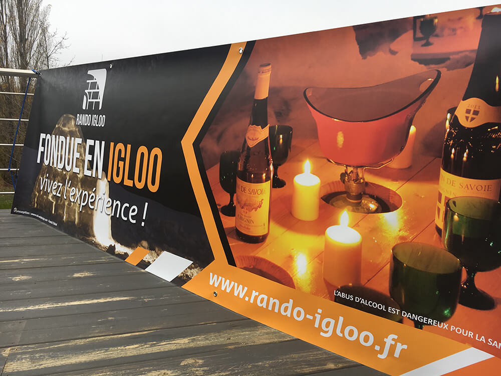 Réalisation d’une banderole permettant de faire la promotion de soirées fondue en igloo. Toutes nos banderoles sont imprimées et préparées sur place. Décor réalisé par notre partenaire graphique OAK-Webdesign.