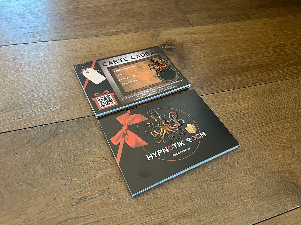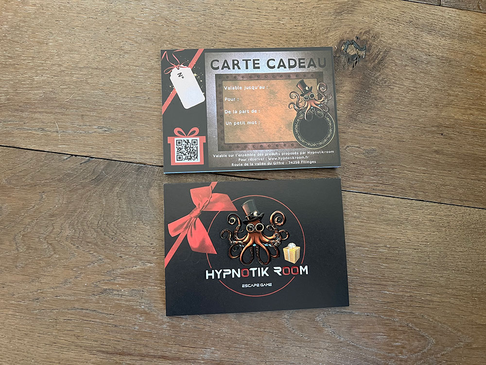Impression des bons cadeaux de ce nouvel Escape Game qui vous ouvrir prochainement ses portes sur Fillinges. Adaptation graphique réalisée par notre partenaire OAK-Webdesign.