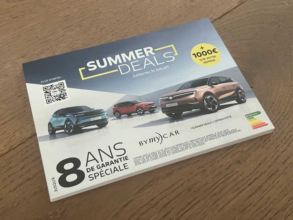 Adaptation des fichiers print et impression de bons de reprise pour les concessions Opel By My Car, destinés à encourager l’achat auprès d’une clientèle souhaitant profiter des Summer Deals, valables jusqu’au 31 juillet 2025. Fichiers graphiques fournis par le client.