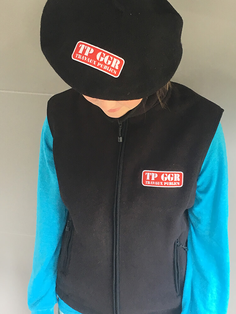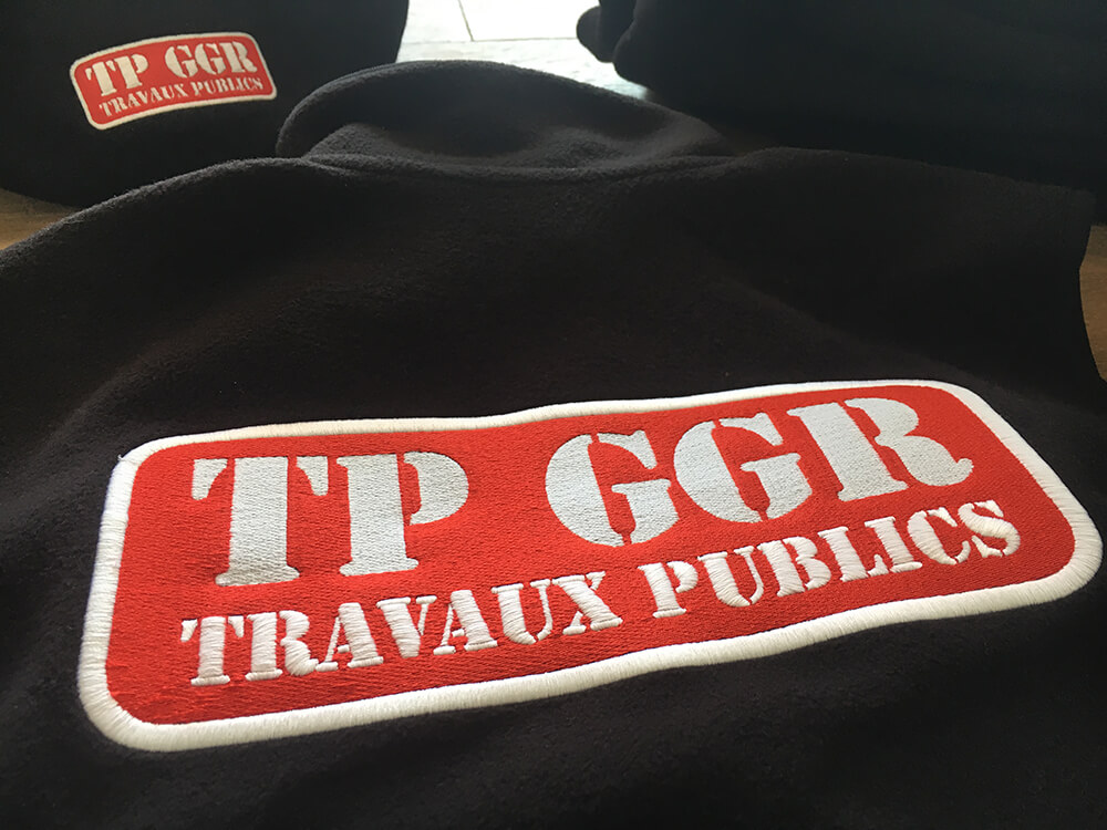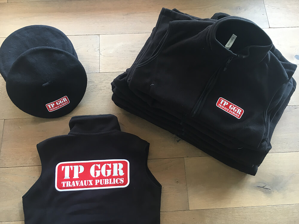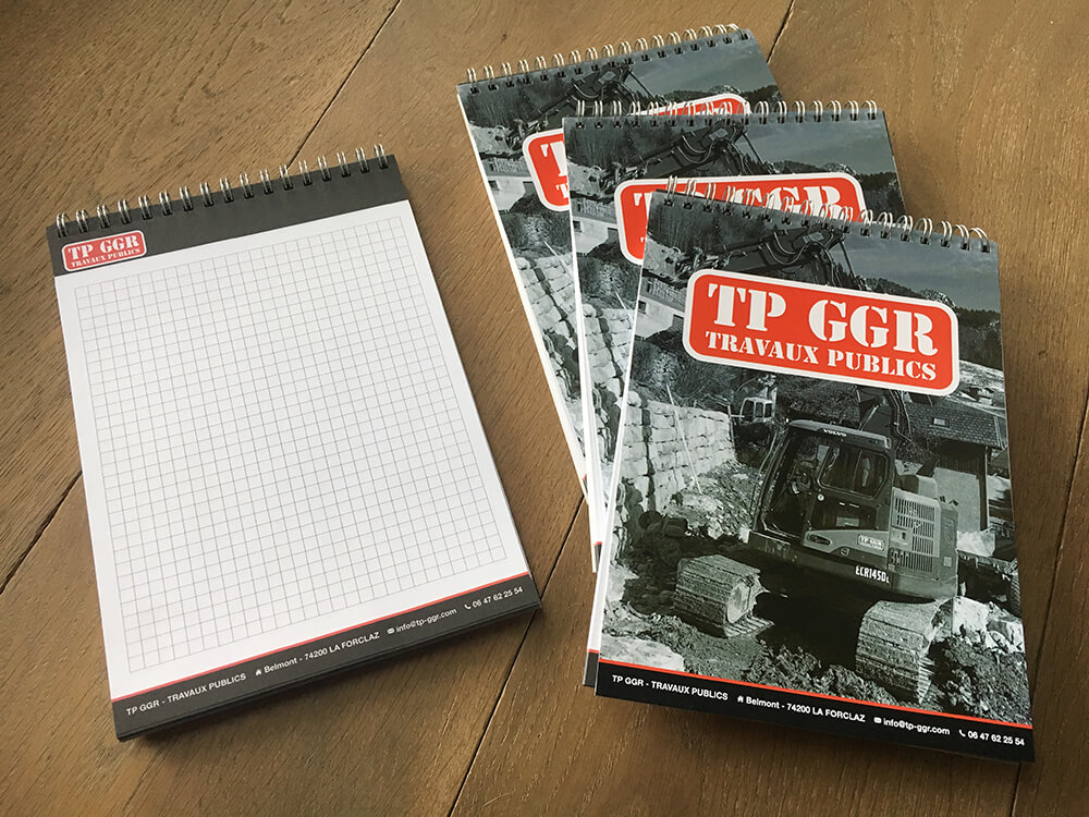 Broderie sur vêtements et création de bloc-notes personnalisés pour une entreprise de travaux publics.
