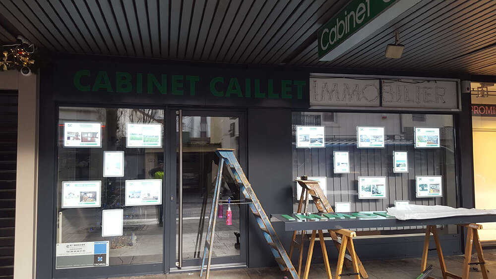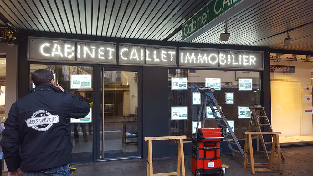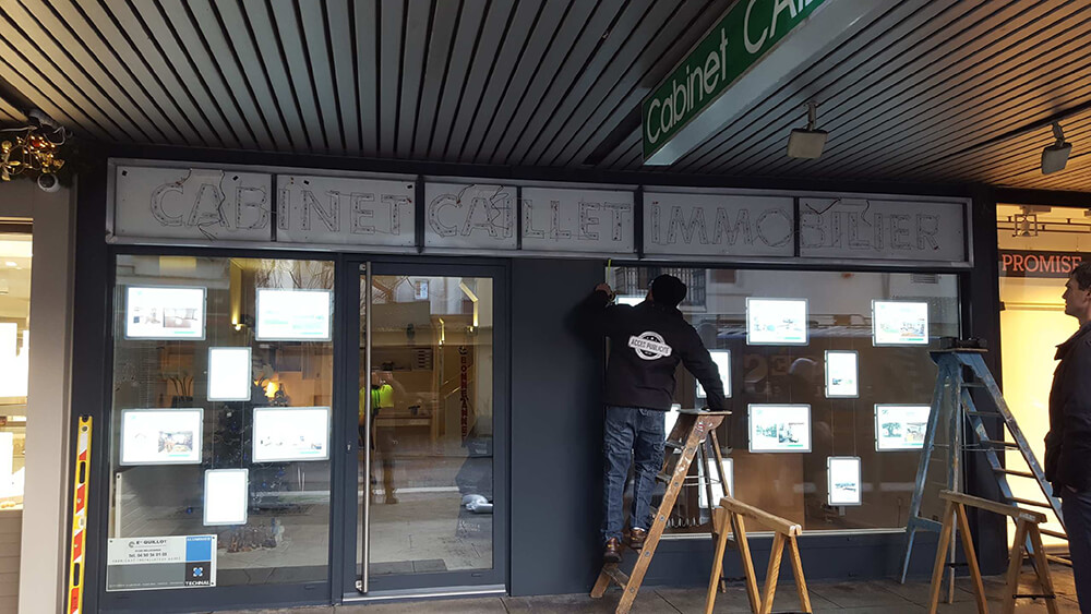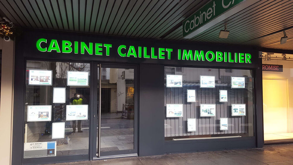 Création d’un caisson lumineux avec lettres reliefs et éclairage Leds pour une agence immobilière d’Annemasse. Décor réalisé par nos soins.