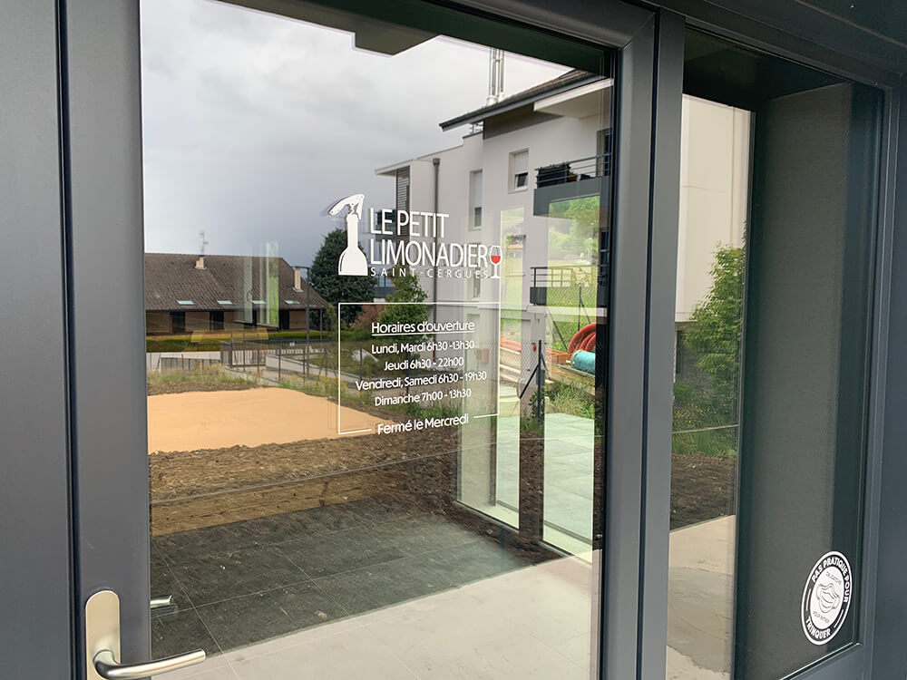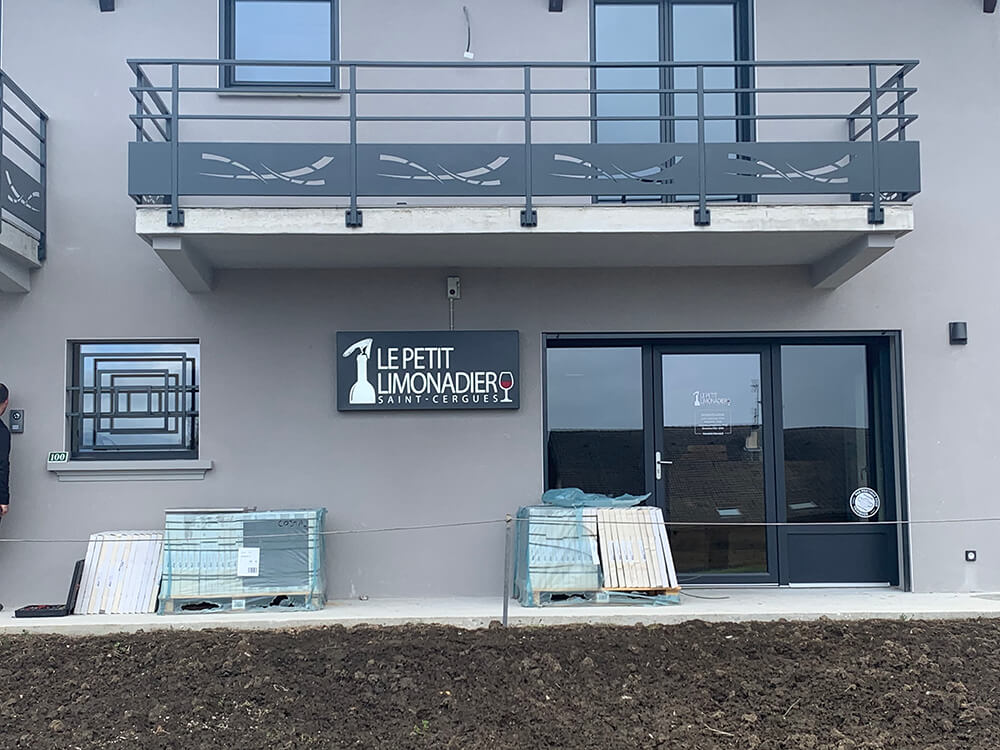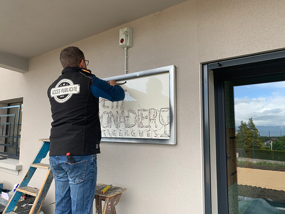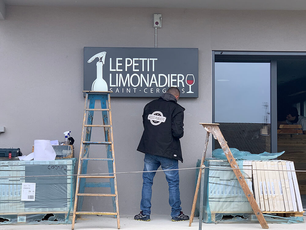Fabrication & installation d’une enseigne en alu avec textes en découpe et éclairage led pour l’ouverture d’un nouveau bar à Saint-Cergues. Création graphique réalisée par notre partenaire OAK-Webdesign.