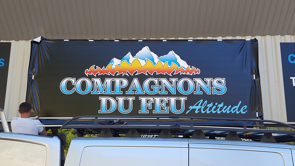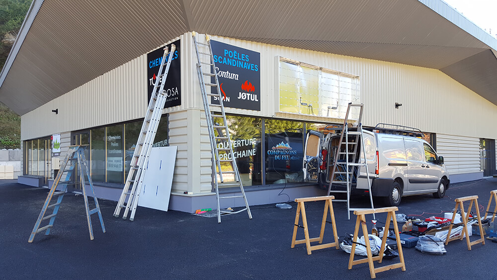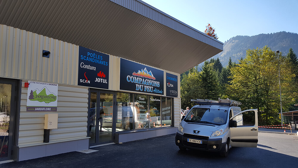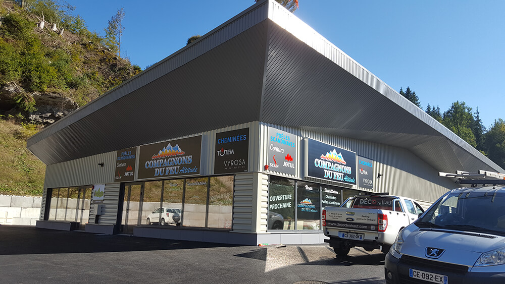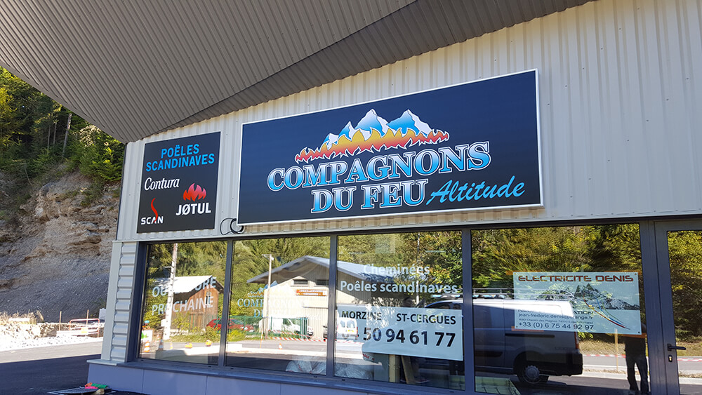 Création d’enseignes lumineuses en caisson Alu et toile tendue pour ce nouveau magasin « Les compagnons du feu » situé sur Morzine. Décor réalisé par nos soins.