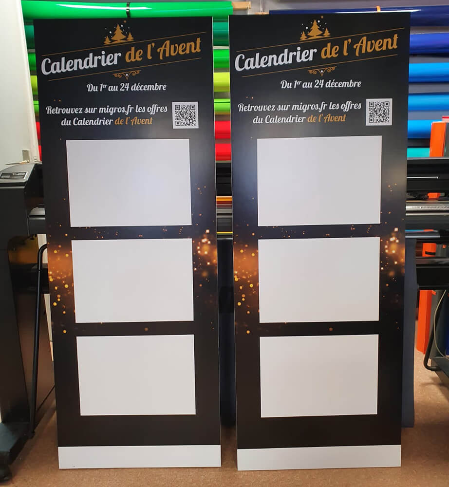 Création d’un calendrier de l’avent géant en PVC mousse pour le centre commercial Migros situé à Etrembière. Décor réalisé par nos soins.