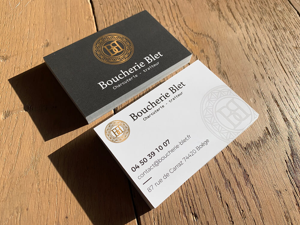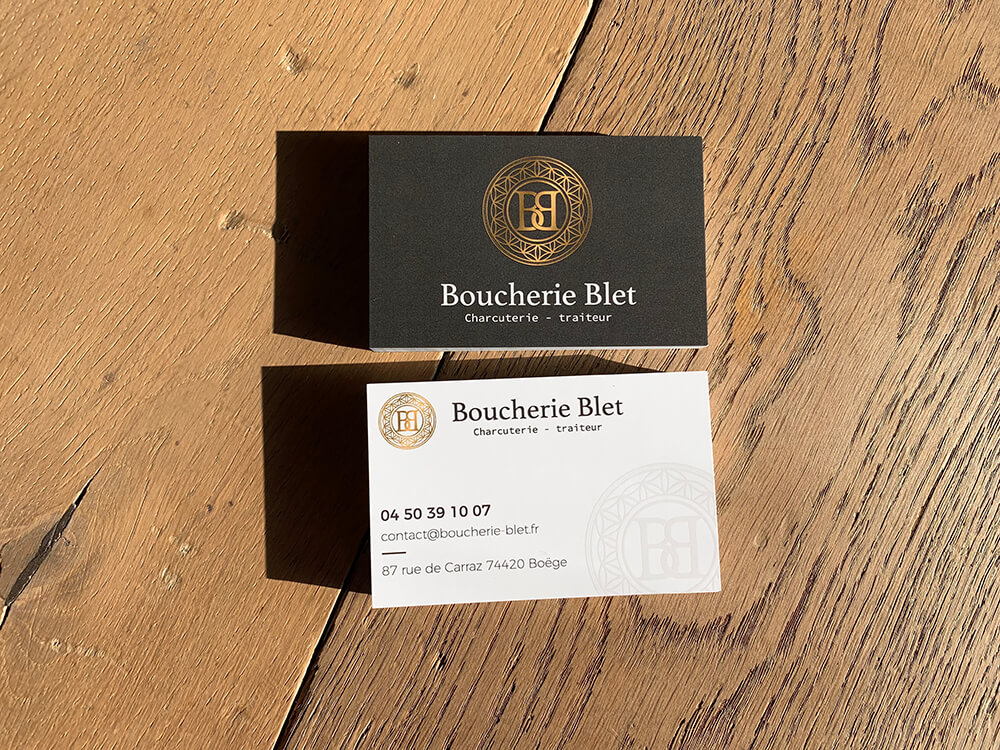 Création & impression des cartes de visite avec finition en vernis sélectif pour cette nouvelle boucherie installée à Boëge. Création graphique réalisée par notre partenaire OAK-Webdesign.