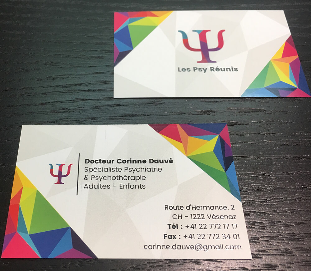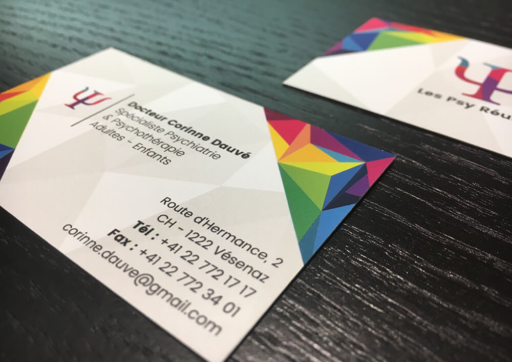 Création d’une charte graphique et de cartes de visite pour un médecin psychiatre basé à Genève. Afin de se démarquer, un vernis sélectif été appliqué sur les principaux éléments de la carte. Supports de communication imprimés par nos soins.