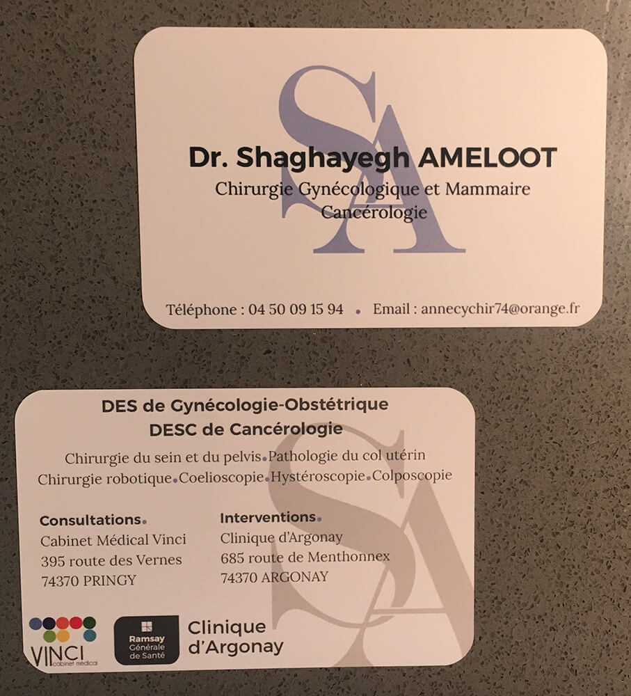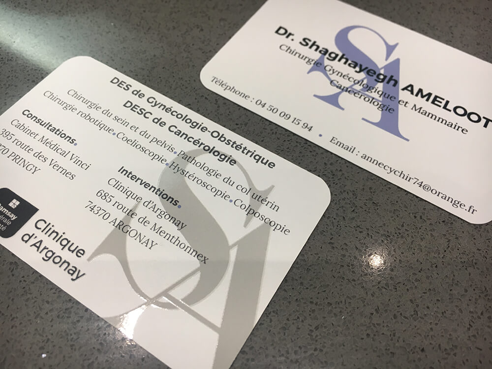 Création d’une charte graphique et de cartes de visite pour un chirurgien gynécologue basé à Pringy. Afin de se démarquer, un vernis sélectif été appliqué sur les principaux éléments de la carte. Supports de communication imprimés par nos soins.