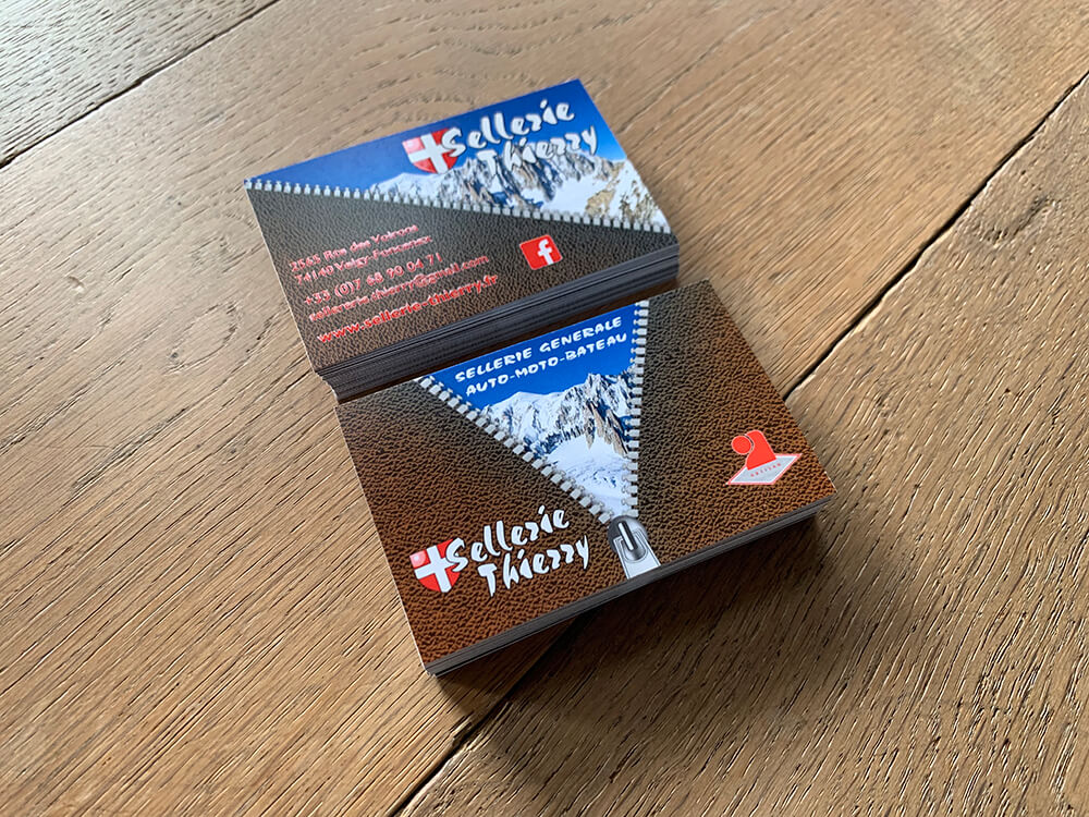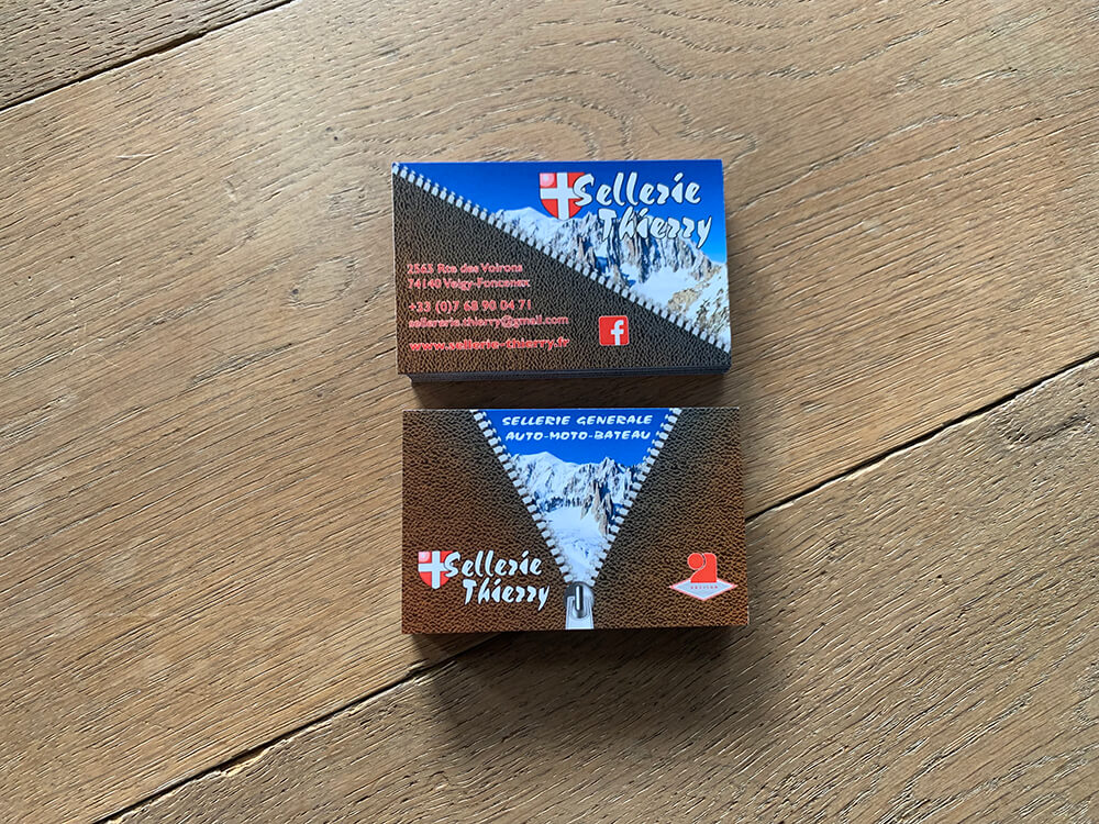 Impression des cartes de visite avec finition en vernis sélectif pour un artisan sellier installé à Veigy-Foncenex. Création graphique réalisée par notre partenaire OAK-Webdesign.