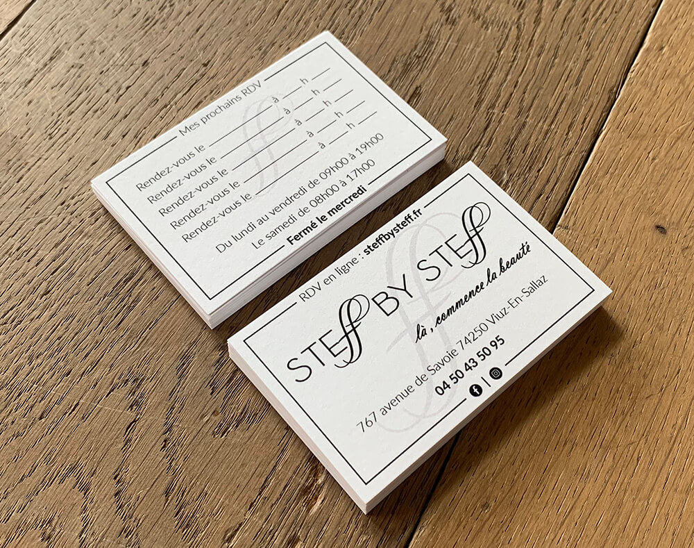 Impression des nouvelles cartes de visite d’un salon de coiffure installé à Viuz En Sallaz. Création graphique réalisée par notre partenaire OAK-Webdesign.