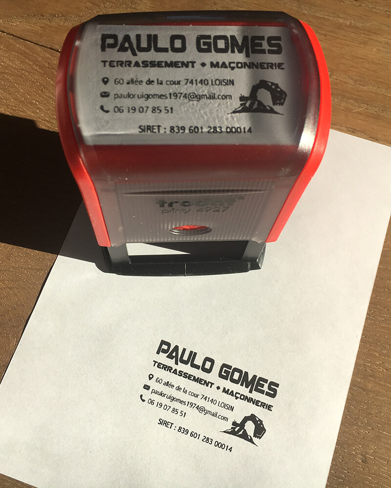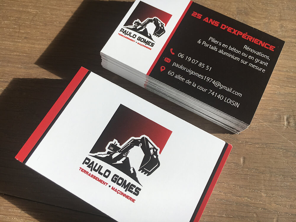 Visuel, cartes de visite et tampon encreur pour une entreprise de terrassement/maçonnerie. Afin de renforcer l’esprit qualitatif des cartes de visite, un vernis sélectif été appliqué sur certains éléments. Support de communication imprimé par nos soins.