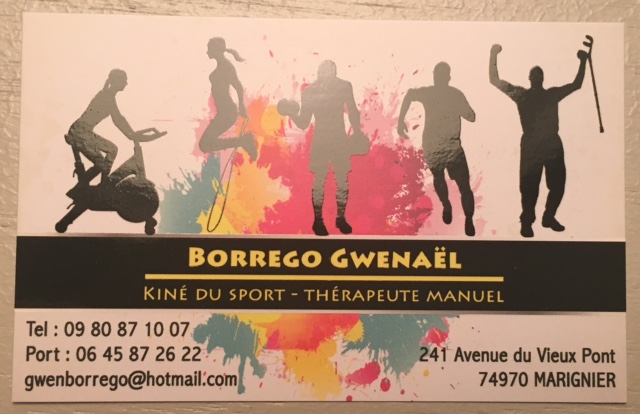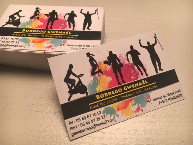 Création d’une carte de visite originale à la finition en vernis sélectif pour un kiné spécialiste du sport.