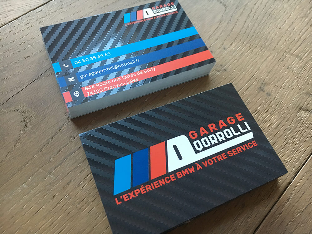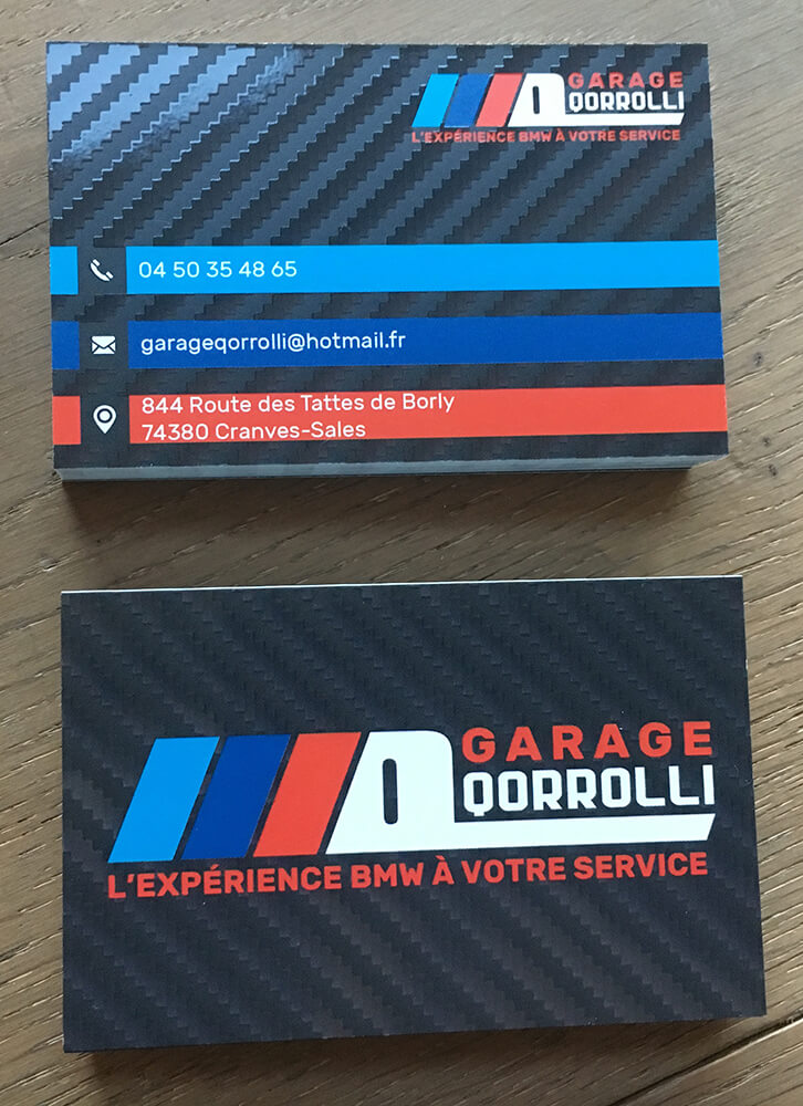 Refonte graphique du logo & Création des cartes de visite pour ce garagiste spécialisé dans la marque BMW. Afin de renforcer le côté haut de gamme de la carte, nous avons opté pour un fond effet carbone mis en valeur avec du vernis sélectif. Supports de communication imprimés par nos soins.