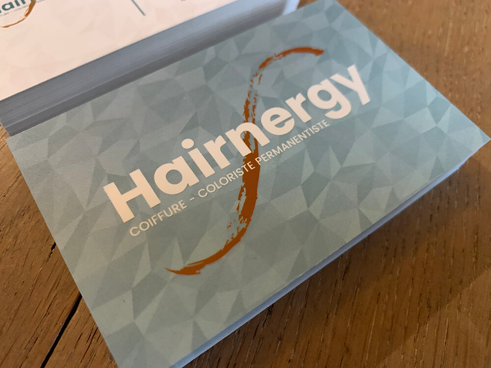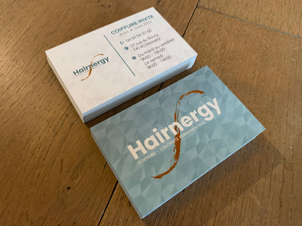Création des cartes de visite avec finition en vernis sélectif pour un salon de coiffure installé à Messery. Support de communication imprimé par nos soins. Création graphique réalisée par notre partenaire OAK-Webdesign.