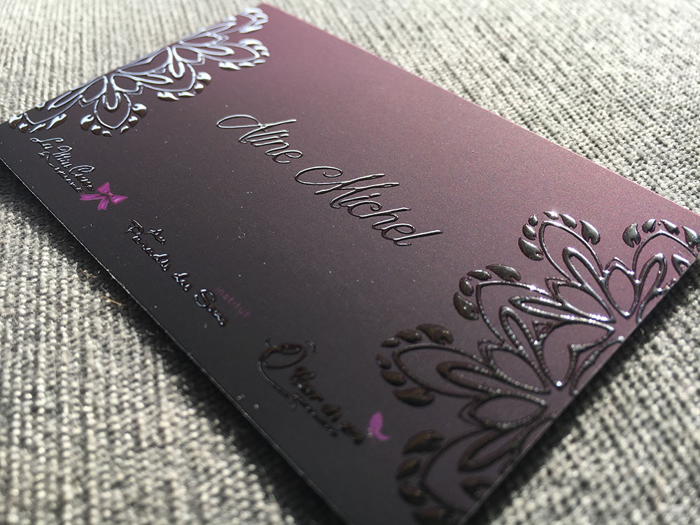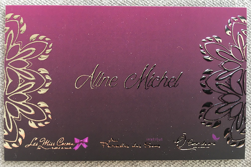 Création d’une identité visuelle à l’ambiance zen pour cette gérante d’instituts de beauté. Afin de se démarquer, une finition dorure à chaud à même été appliquée.
