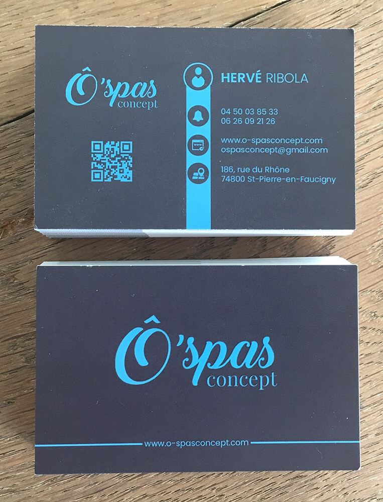 Refonte graphique des cartes de visite de la société Ô Spas Concept, pisciniste installé dans le Faucigny. Afin de renforcer l’esprit qualitatif des cartes de visite, un vernis sélectif été appliqué sur certains éléments. Supports de communication imprimés par nos soins.