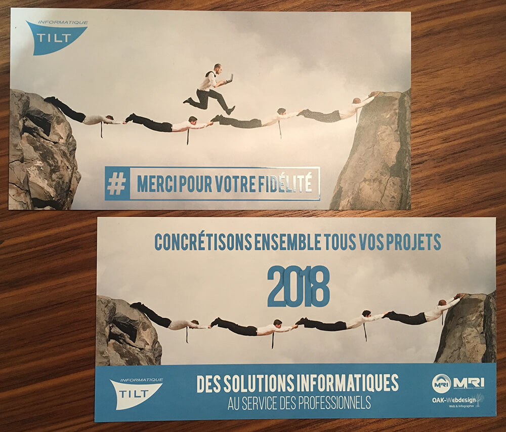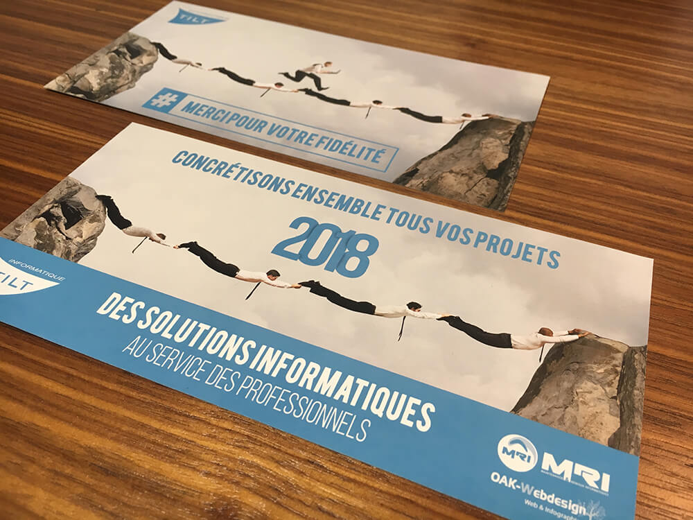 Création de cartes de vœux originales pour une société informatique basée à Thonon et Ville la Grand. Afin de se démarquer, un vernis sélectif été appliqué sur les principaux éléments de la carte. Supports de communication imprimés par nos soins.