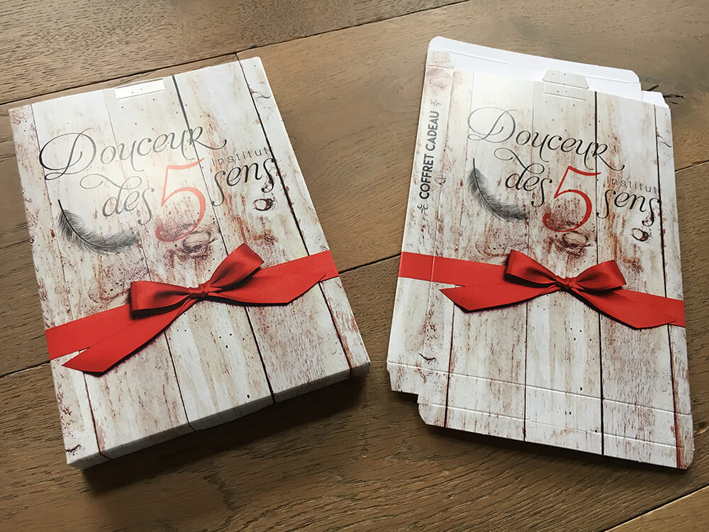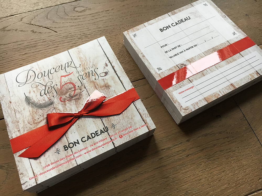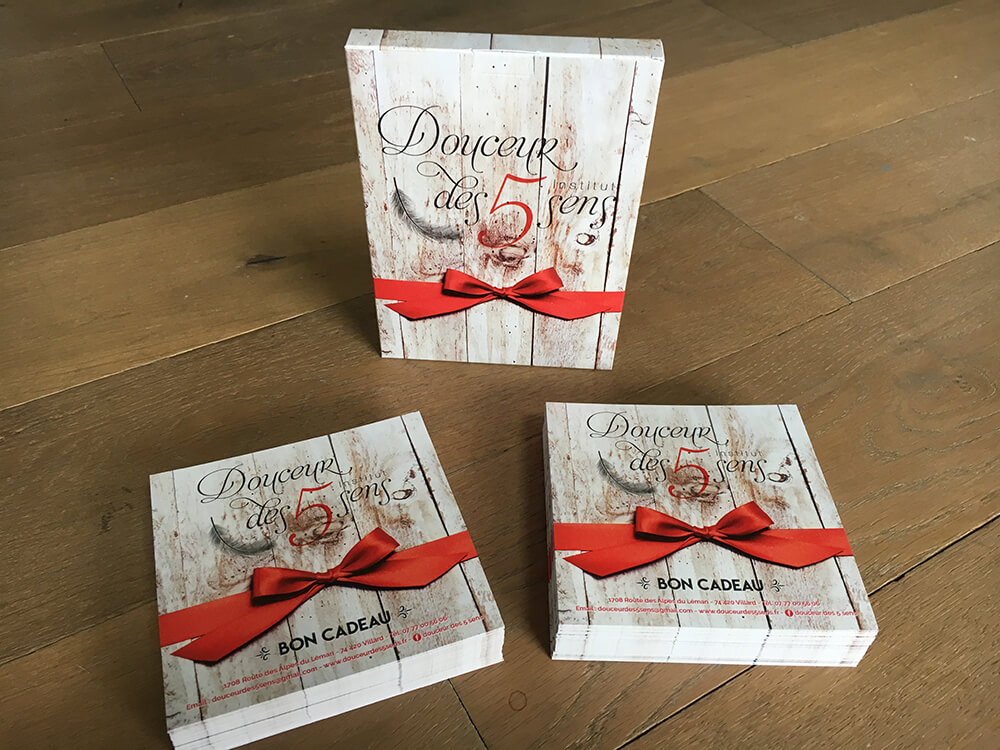 Création de coffrets cadeaux et de bons cadeaux pour un institut de beauté basé à Villard. Supports de communication imprimés par nos soins.