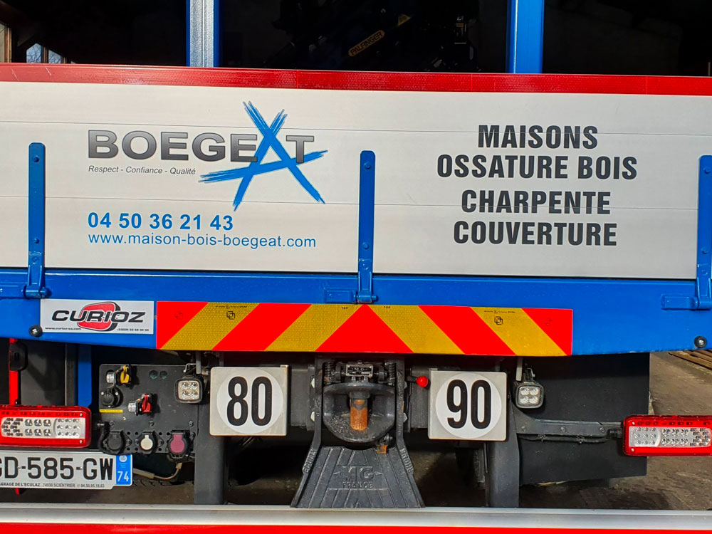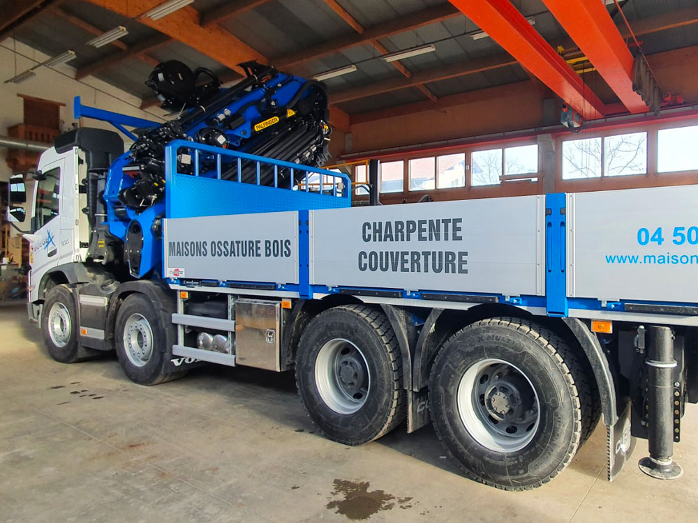 Réalisation d’un covering XXL sur le nouveau véhicule de cette entreprise de charpente, couverture et maisons à ossature bois installée à Nangy. Décor réalisé par nos soins.
