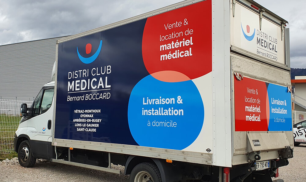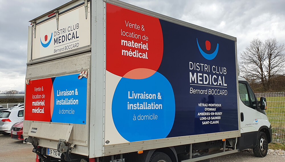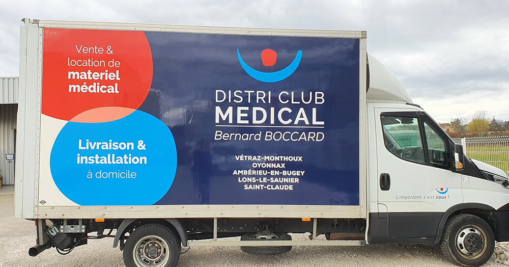 Réalisation d’un covering XXL sur le nouveau véhicule de l’entreprise Distri Club Médical installé à Cranves-Sales. Décors fournis par l’entreprise conformément à sa nouvelle charte graphique.