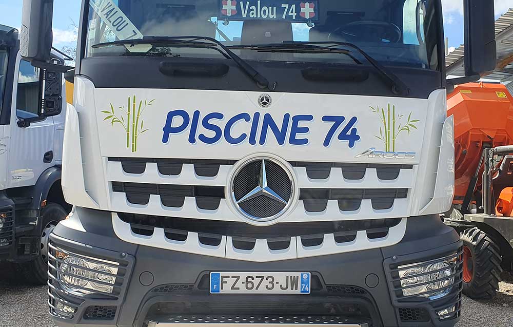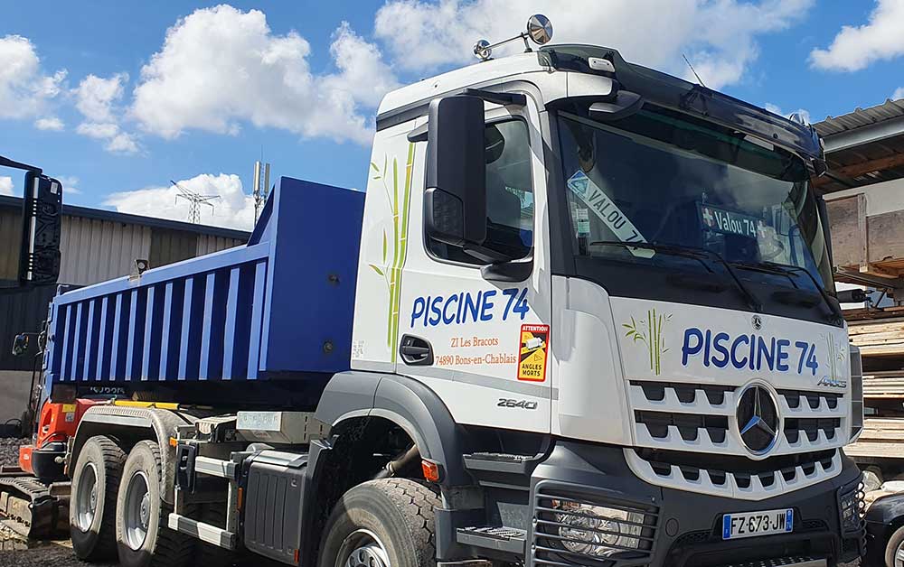 Réalisation de covering XXL sur les 2 nouveaux camions benne de ce pisciniste de Bons-en-Chablais. Décor réalisé par notre partenaire graphique OAK-Webdesign.