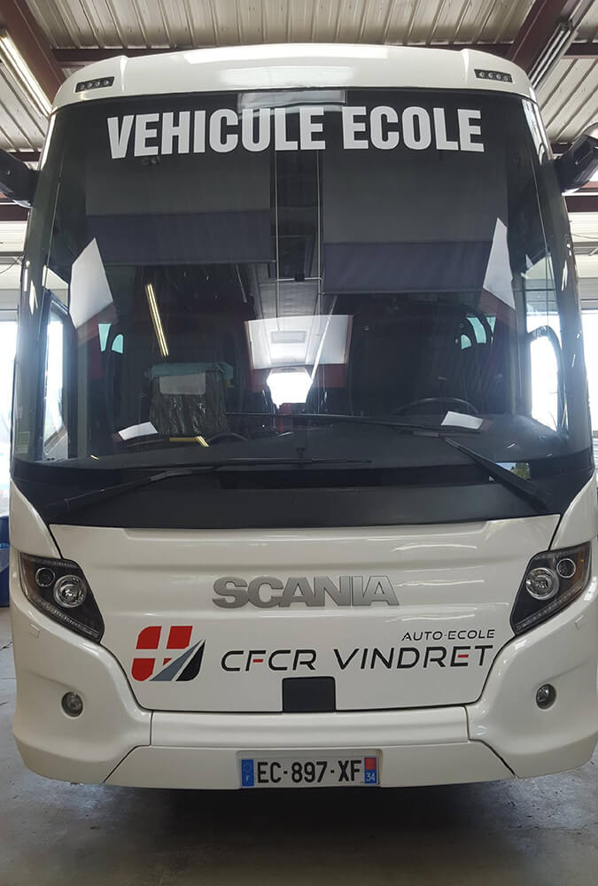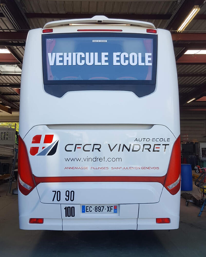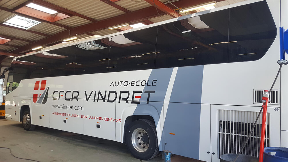 Réalisation d’un covering partiel XXL pour ce bus école de l’entreprise Vindret. Décor réalisé par nos soins et décliné sur toute la flotte de véhicules de l’entreprise.