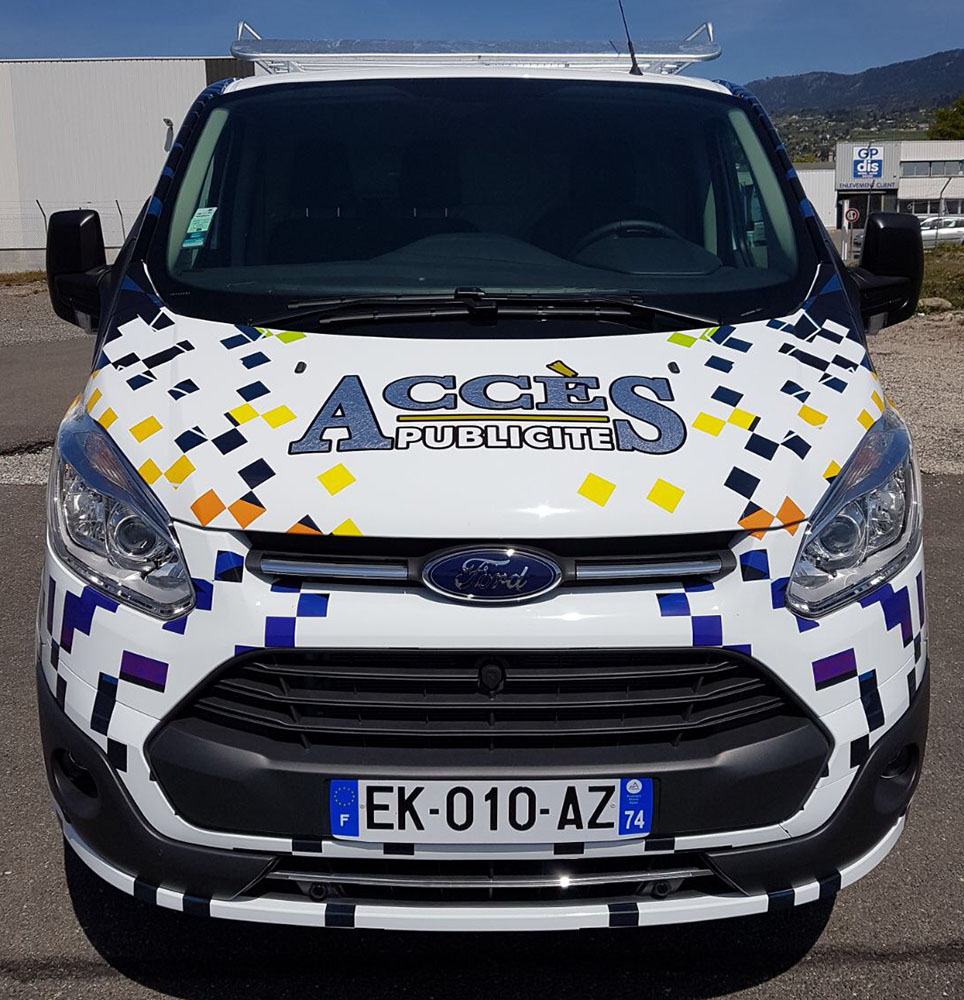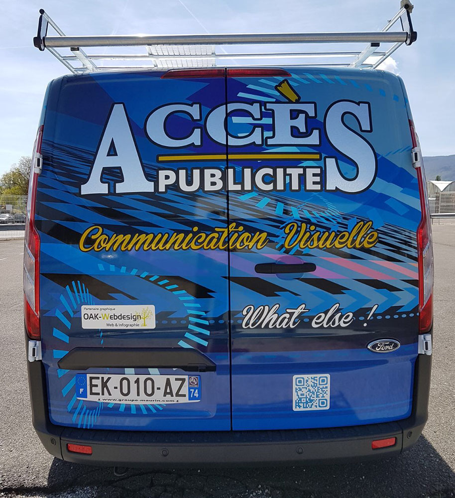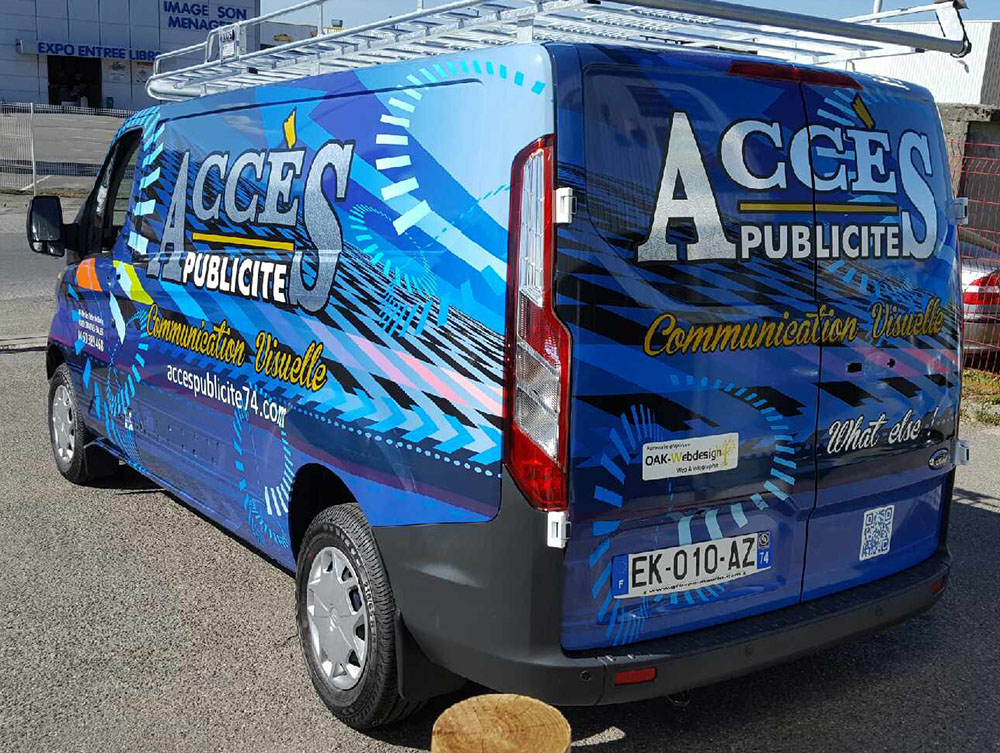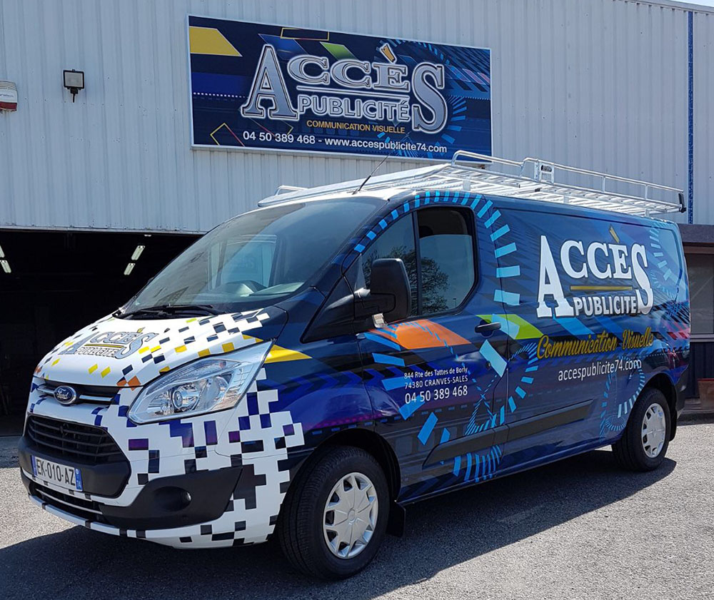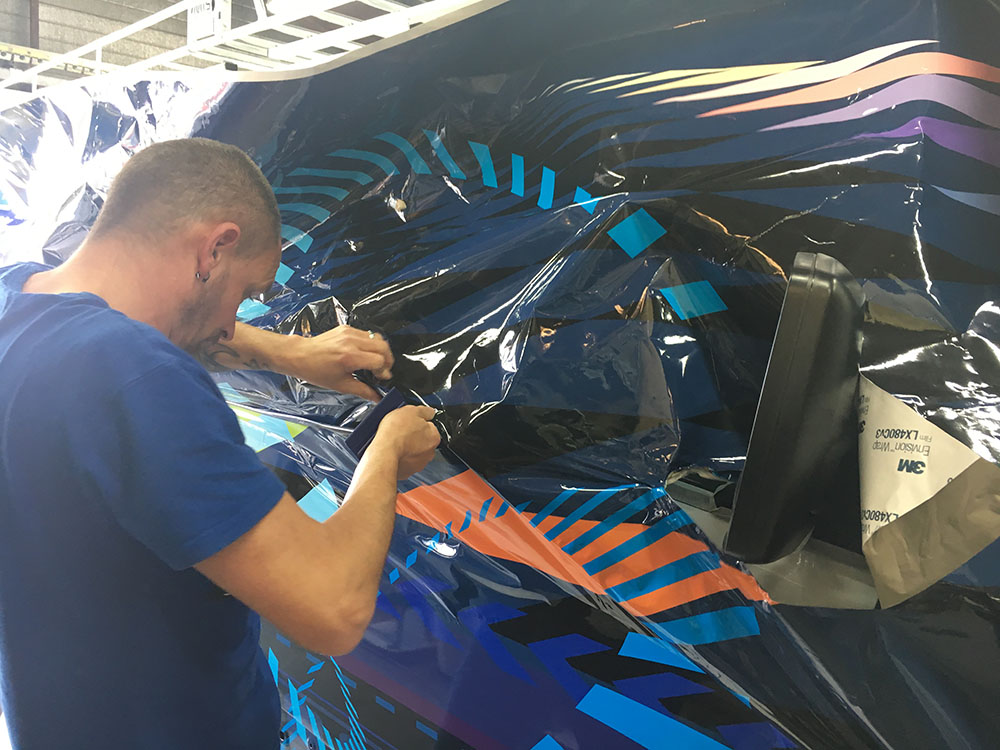 Réalisation d’un covering complet pour le nouveau véhicule de notre société. Pour ce décor, nous avons superposé différentes finitions d’adhésifs 3M haute qualité. Décor réalisé par nos soins