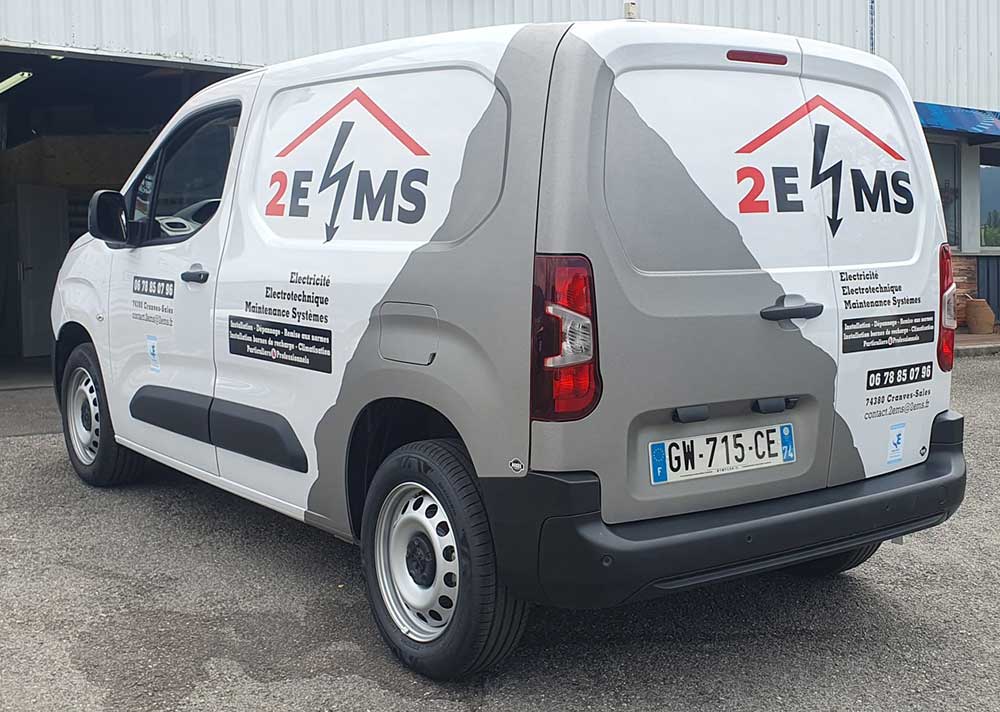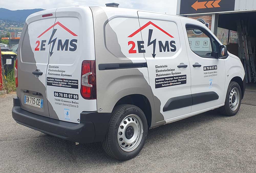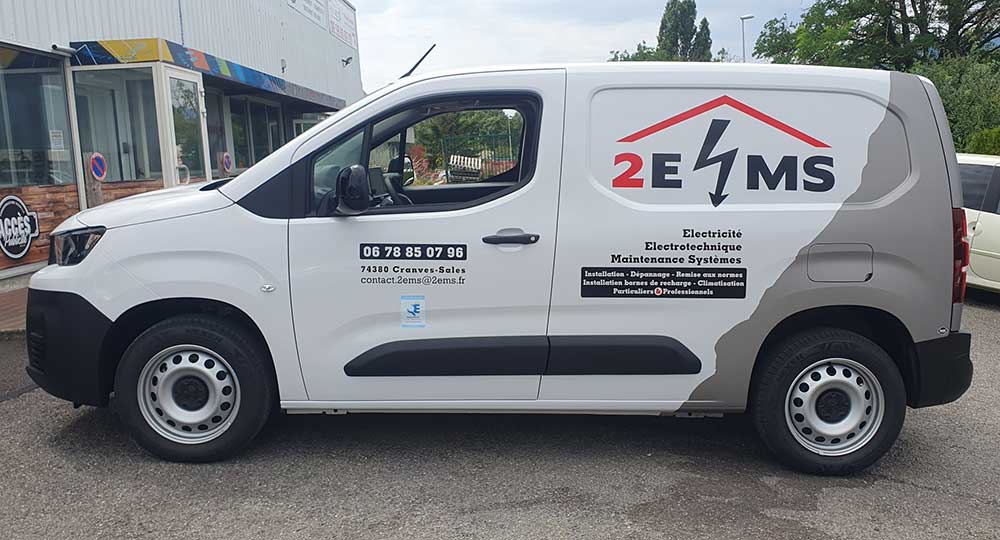 Réalisation d’un covering partiel sur le nouveau véhicule de cette entreprise d’électricité basée à Cranves-Sales. Décor réalisé par nos soins et décliné sur toute la flotte de l’entreprise.