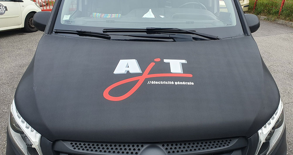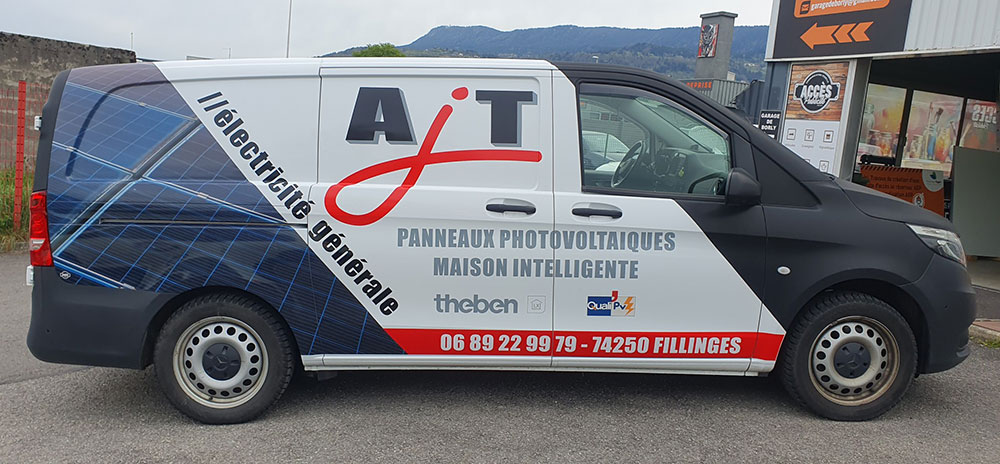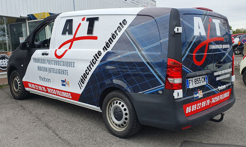 Réalisation d’un covering partiel sur le véhicule d’une entreprise d’électricité générale spécialisée dans la pose de panneaux photovoltaïques. Décor réalisé par nos soins.