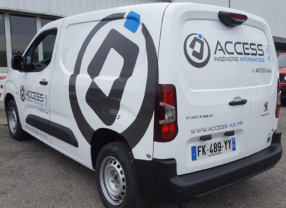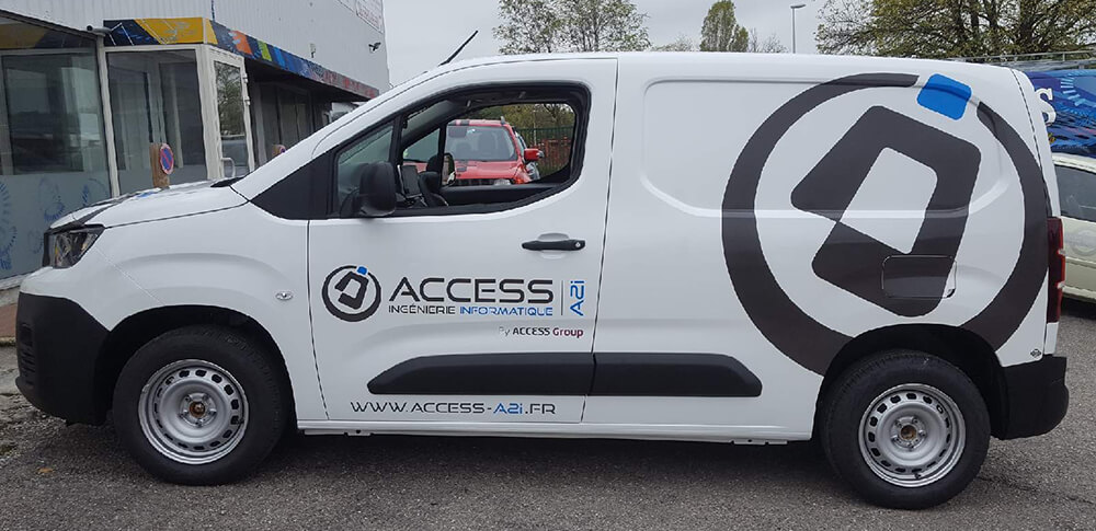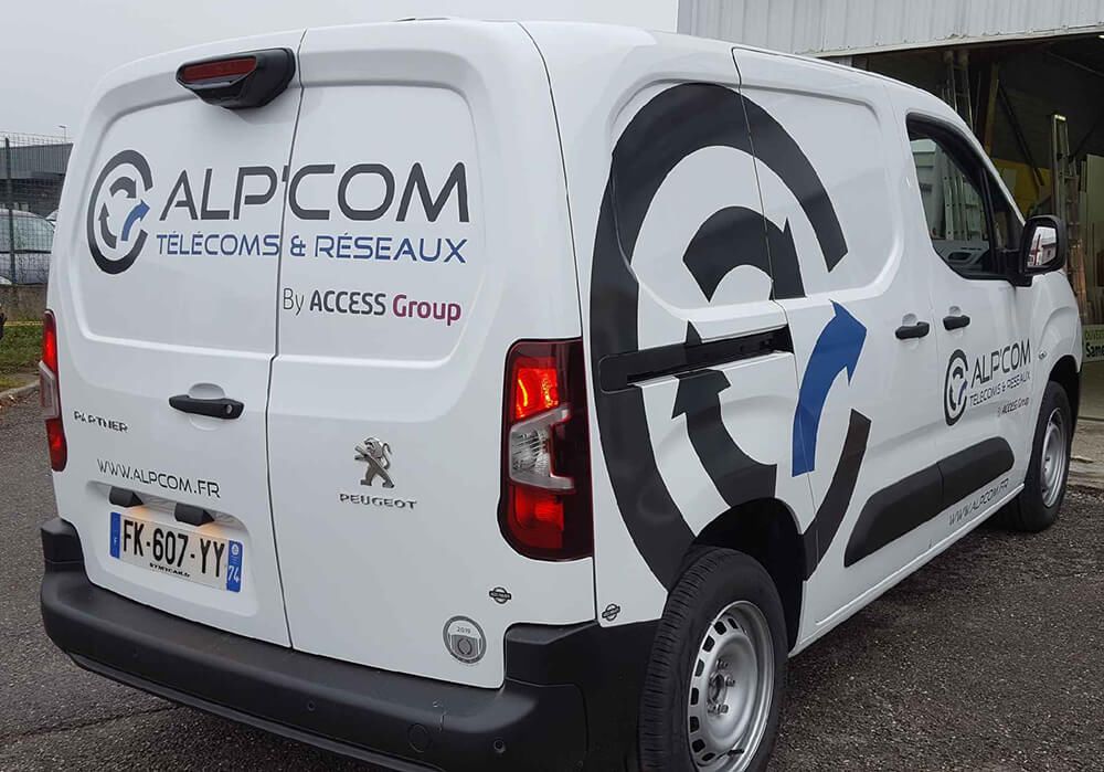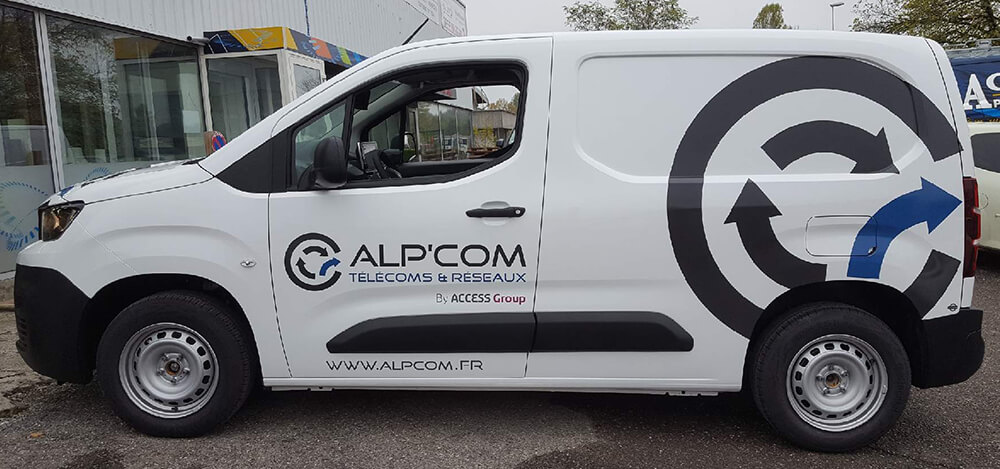 Réalisation de covering partiels pour les véhicules du groupe Access & Alp’Com. Ces décors a été déclinés sur toutes les flottes de véhicules du groupe. Décor réalisé par nos soins.