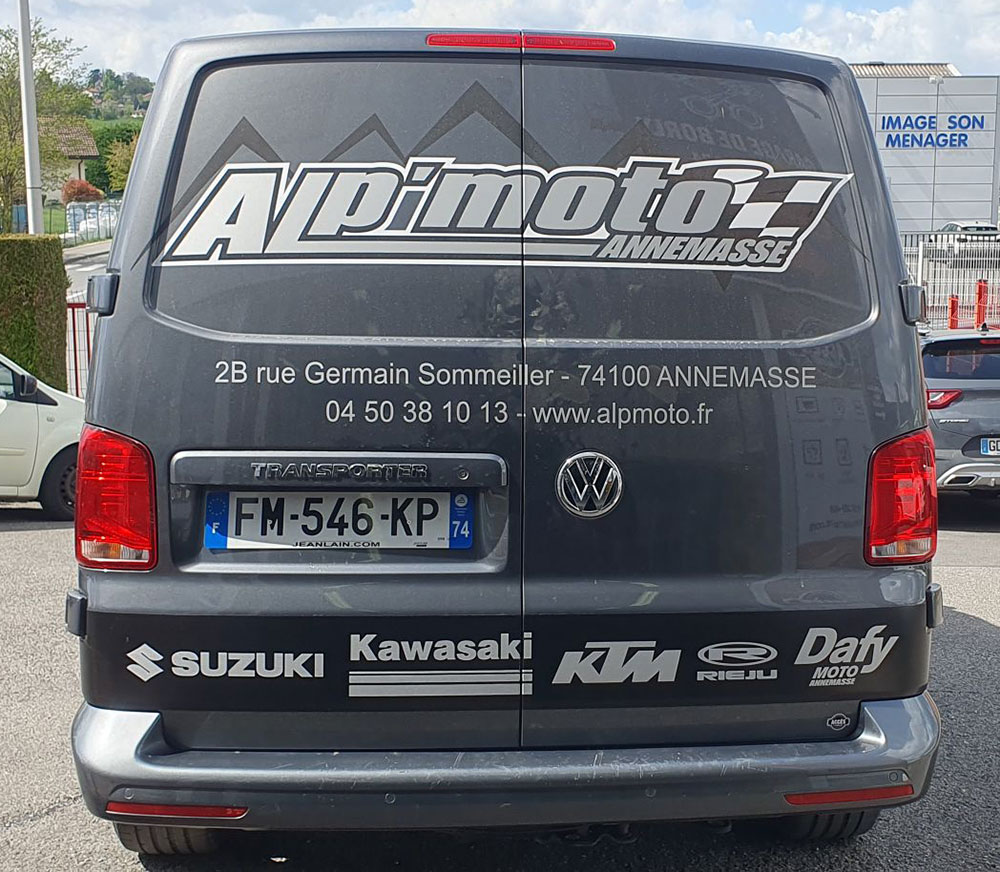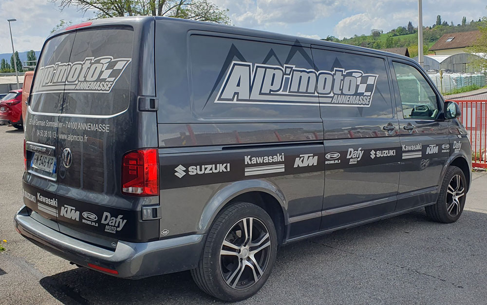 Réalisation d’un covering partiel sur le nouveau véhicule de ce concessionnaire moto installé à Annemasse. Décor réalisé par nos soins et décliné sur toute la flotte de l’entreprise.