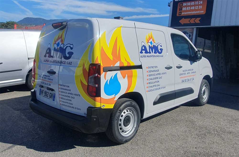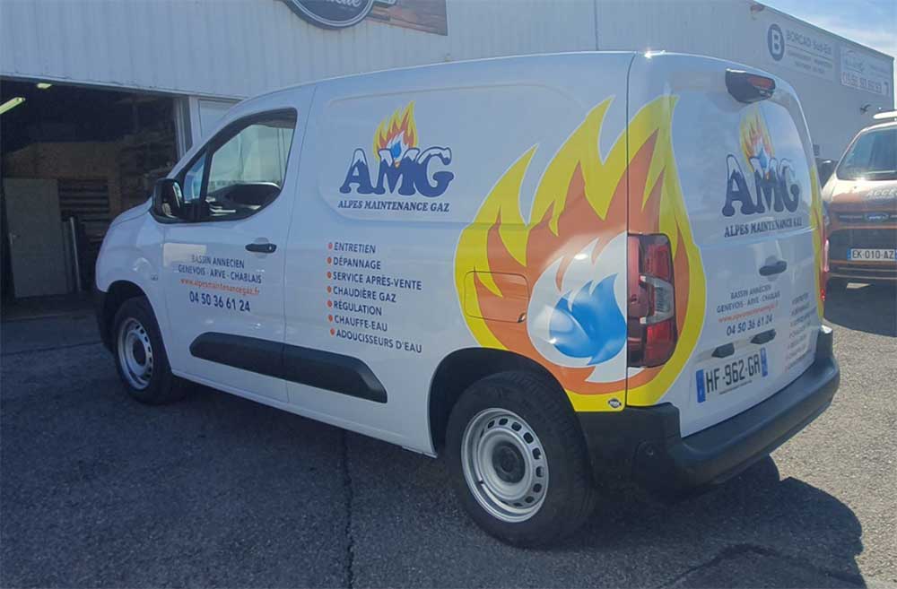 Réalisation d’un covering partiel accompagnée de la création d’une nouvelle charte graphique pour une entreprise de maintenance spécialisée dans l’entretien et le dépannage de chaudières, chauffe-eau et adoucisseurs d’eau. Décor conçu par nos soins et décliné sur l’ensemble de la flotte de véhicules de l’entreprise.