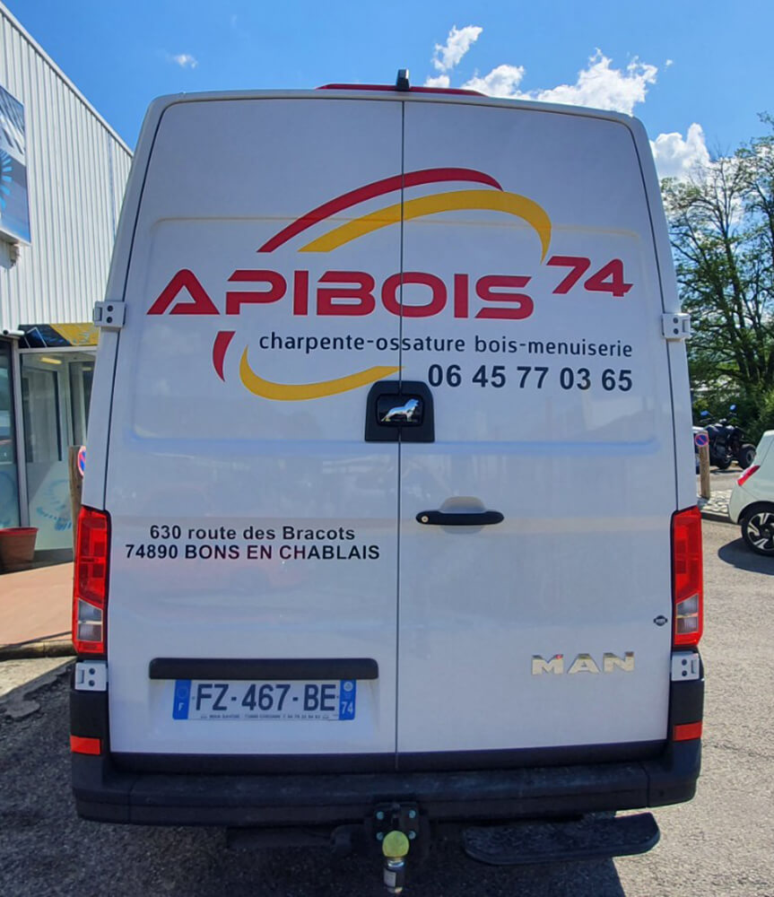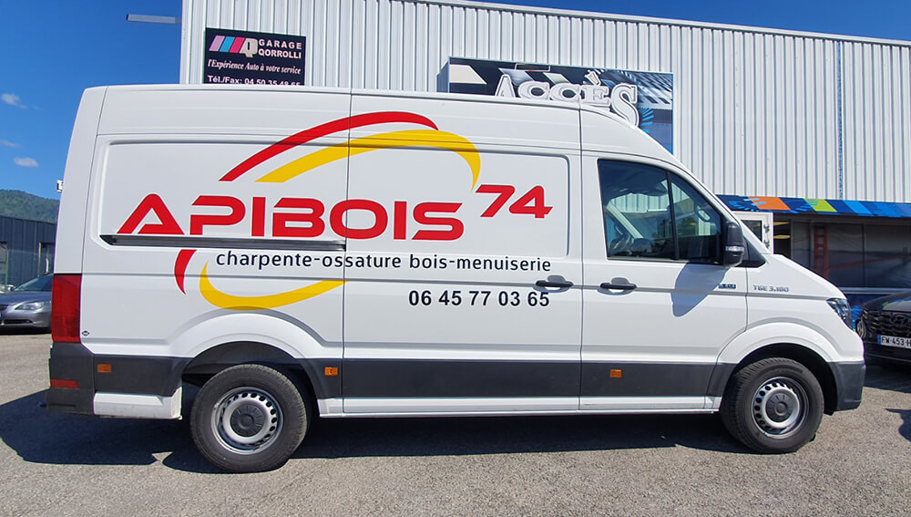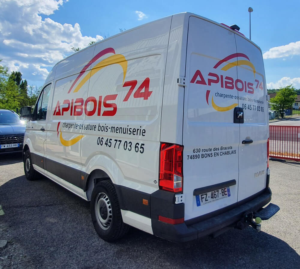 Réalisation d’un covering partiel sur le nouveau véhicule de cette entreprise de charpenterie installée à Bons-En-Chablais. Décor réalisé par nos soins et décliné sur toute la flotte de véhicules.