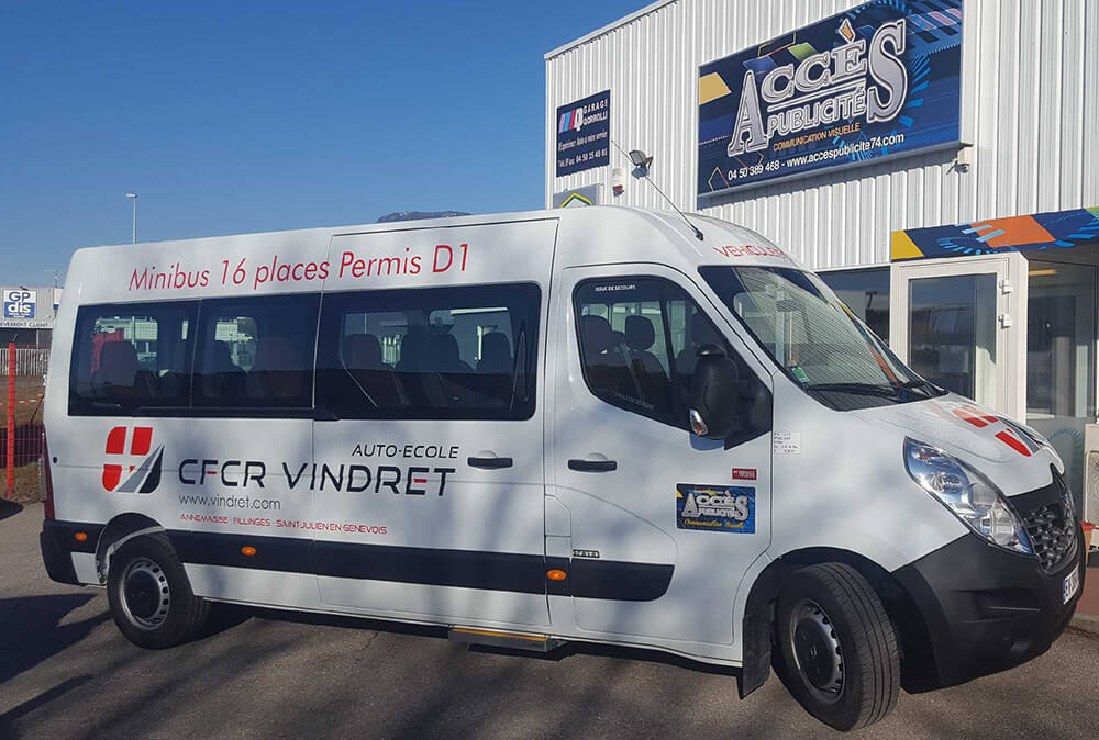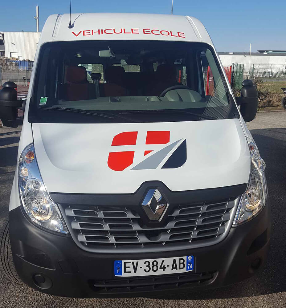 Réalisation d’un covering partiel sur le véhicule d’une auto-école. Ce décor a été décliné sur toute la flotte de véhicules de cette société. Décor réalisé par nos soins.