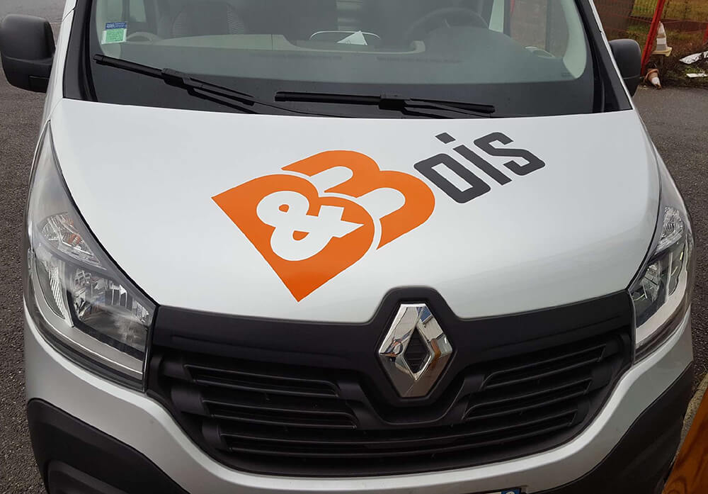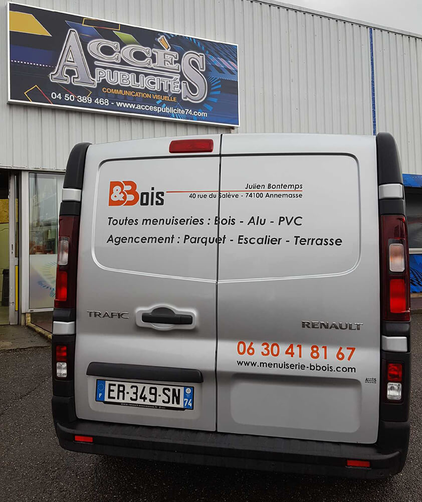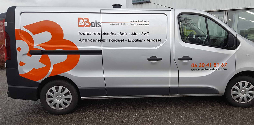 Réalisation d’un covering partiel pour un menuisier intervenant sur le secteur Annemassien. Décor réalisé par notre partenaire graphique OAK-Webdesign.