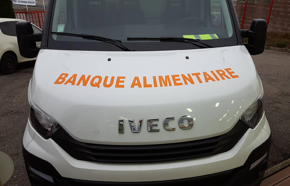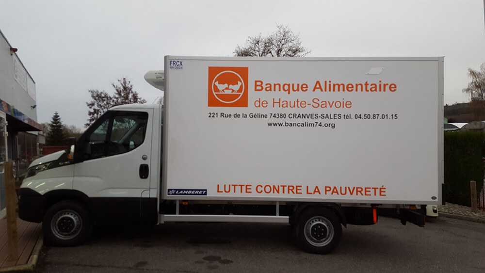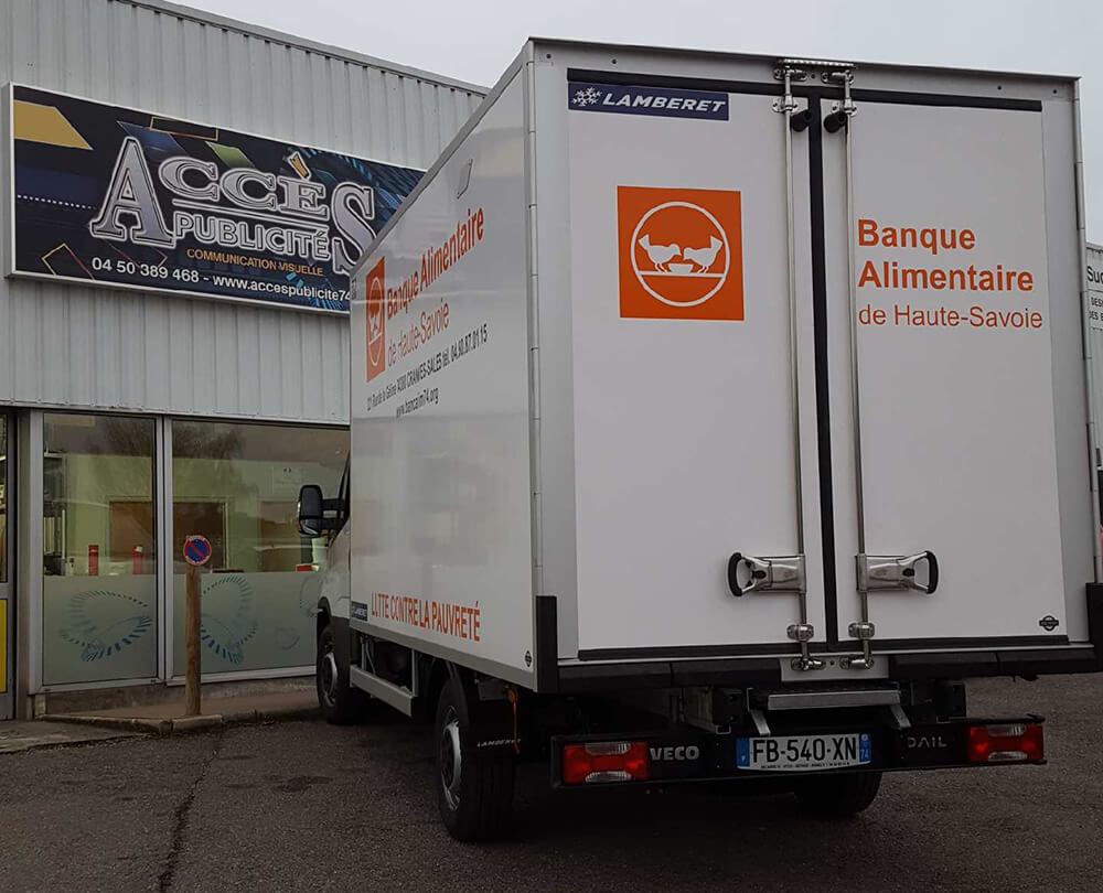 Réalisation d’un covering partiel pour les véhicules de la banque alimentaire de Haute Savoie. Ce décor a été décliné sur toute la flotte de véhicules. Décor réalisé par nos soins