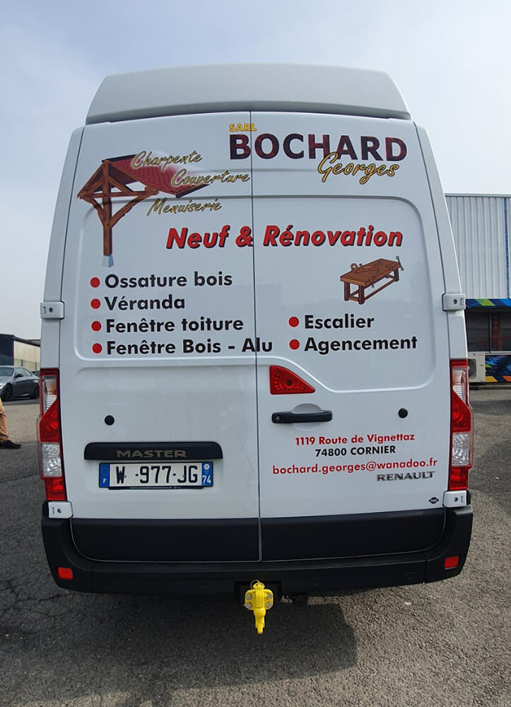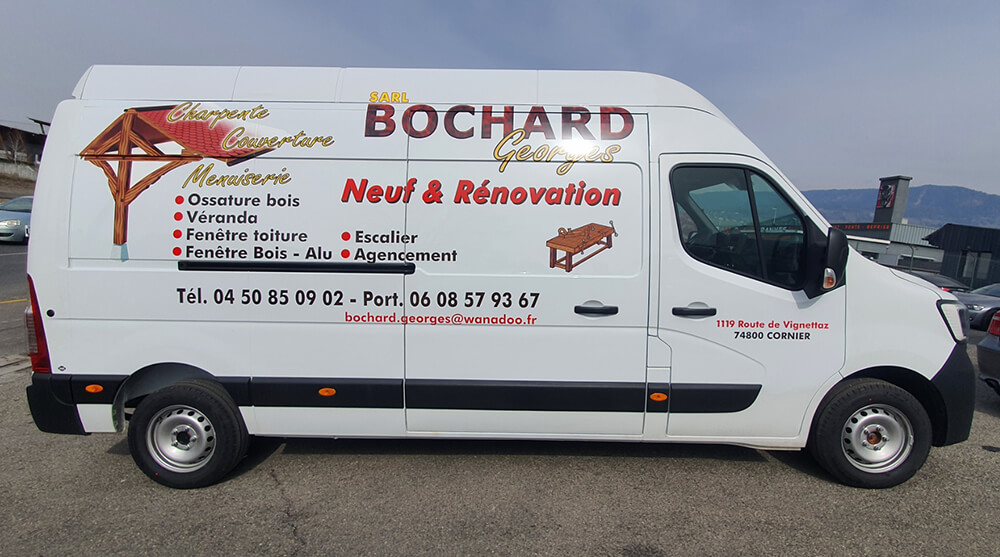 Réalisation d’un covering partiel pour une entreprise de Cornier spécialisée dans les travaux de charpente, couverture et menuiserie. Ce décor a été décliné sur toute la flotte de véhicules de cette société. Décor réalisé par nos soins.