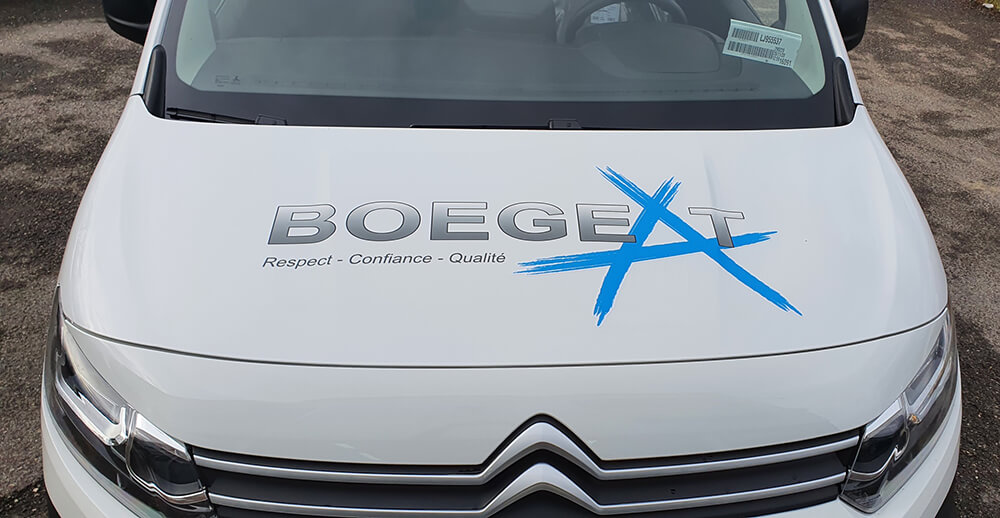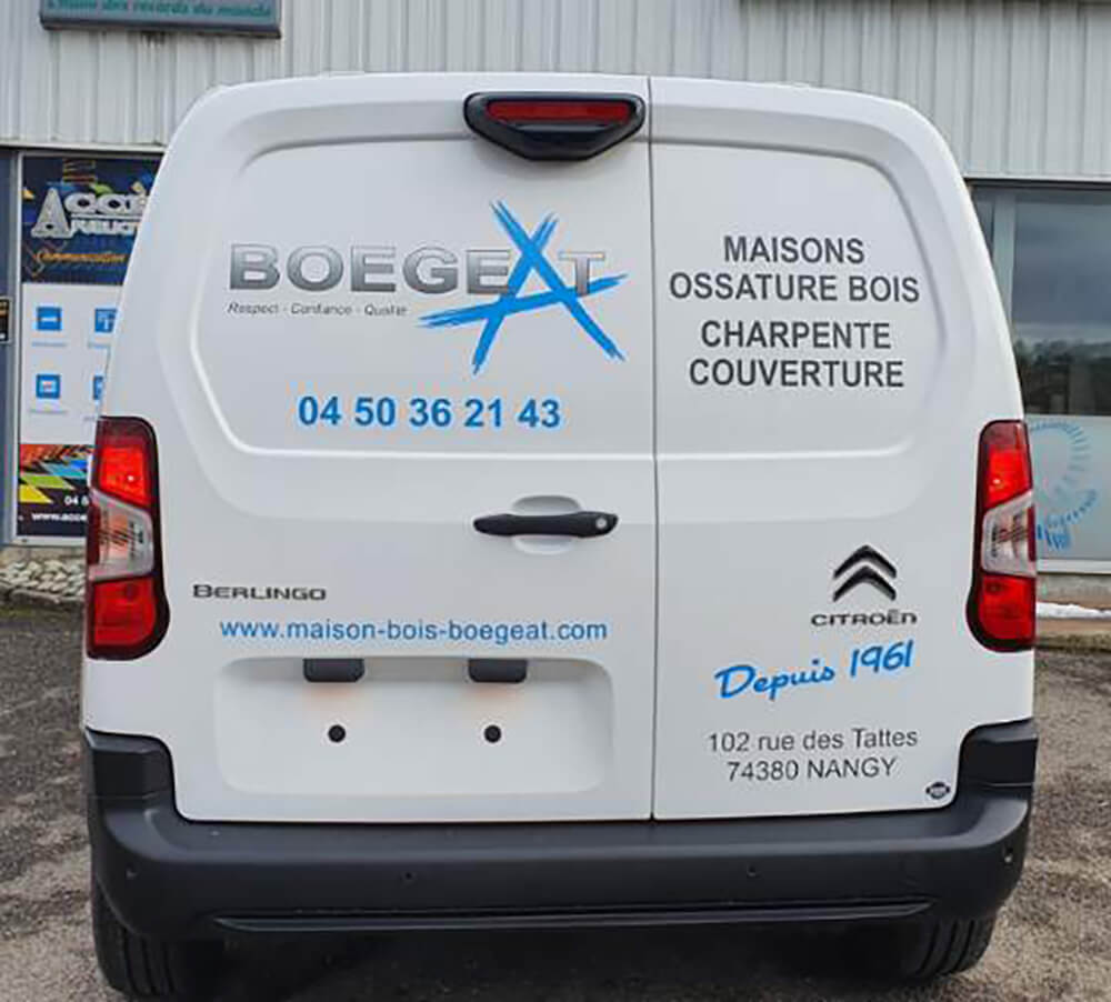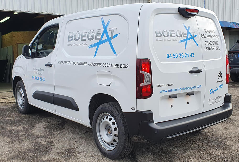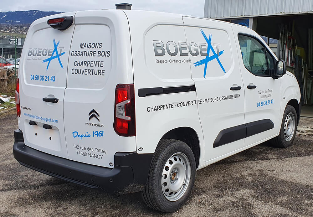 Réalisation d’un covering partiel sur le nouveau véhicule de ce charpentier spécialisé dans la construction de maisons ossature bois. Décor réalisé par nos soins conformément à la charte graphique de l’entreprise et décliné sur toute la flotte de véhicules.