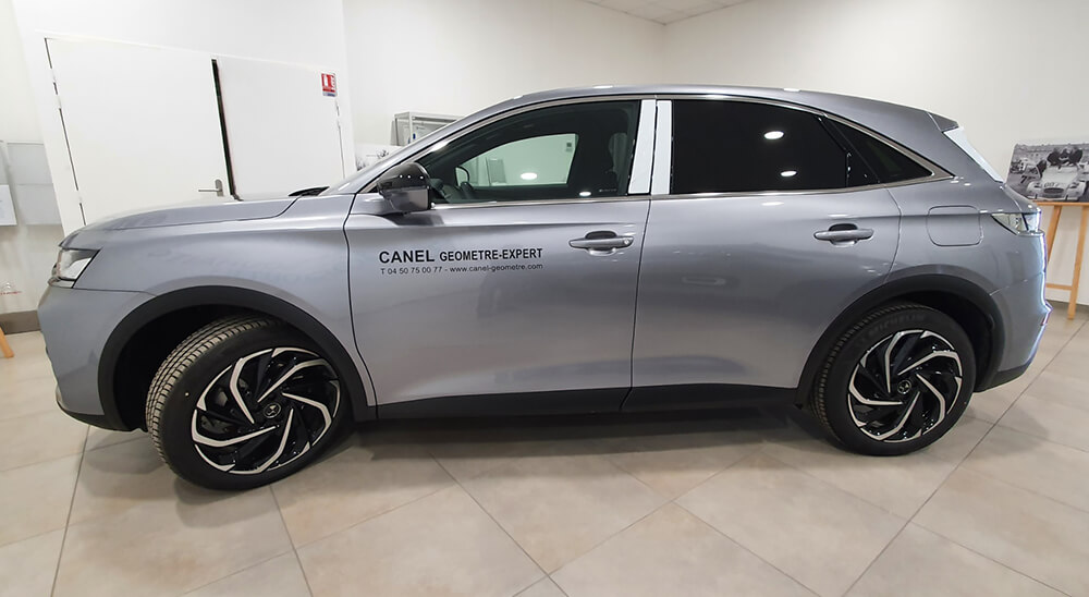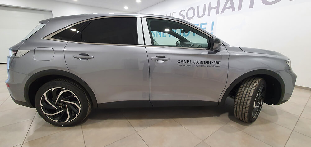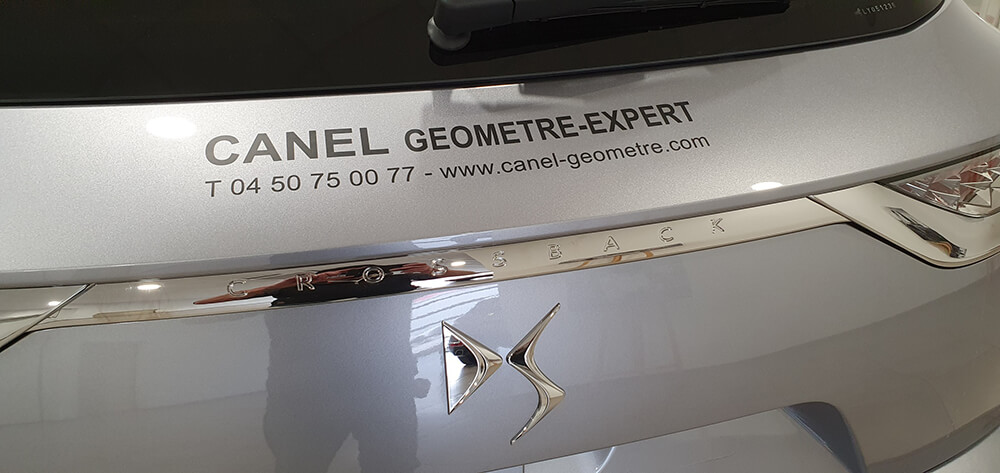 Réalisation d’un marquage de véhicule discret pour un géomètre expert installé à Evian Les Bains. Décor réalisé par nos soins conformément à la charte graphique de l’entreprise.