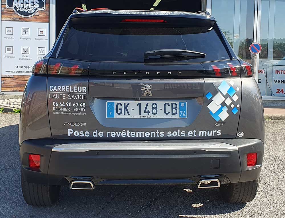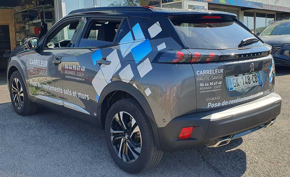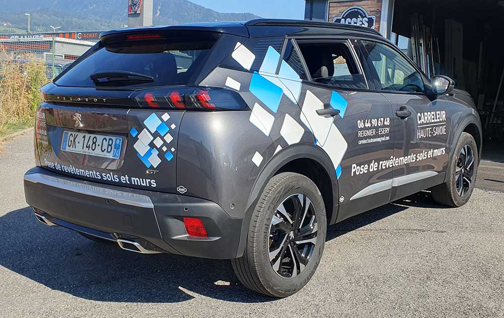Réalisation d’un covering partiel sur le nouveau véhicule de cette entreprise spécialisée dans la pose de revêtements sols et murs. Décor réalisé par nos soins.