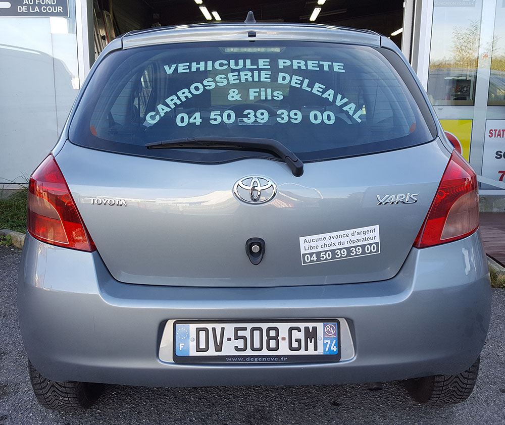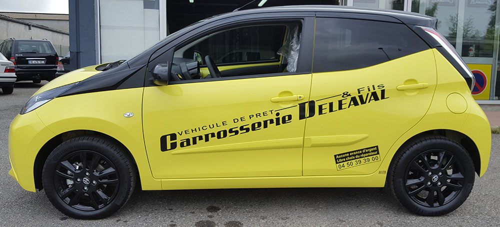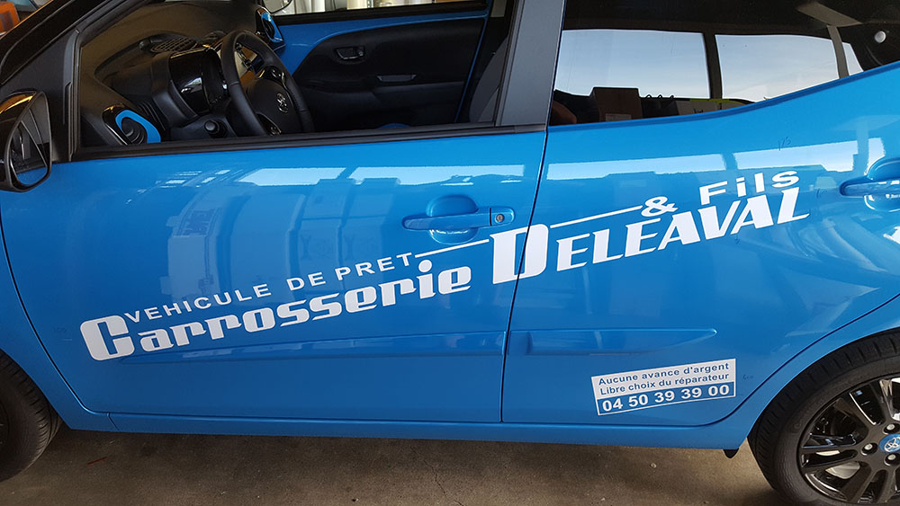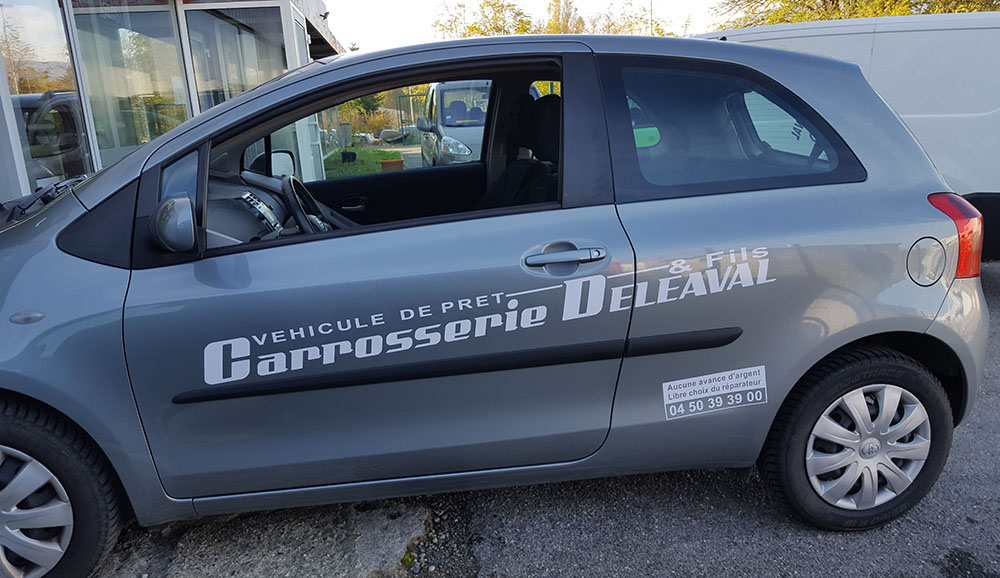 Réalisation d’un covering partiel pour les véhicules de prêt d’une carrosserie. Ce décor a été décliné sur toute la flotte de véhicules de l’entreprise. Décor réalisé par nos soins