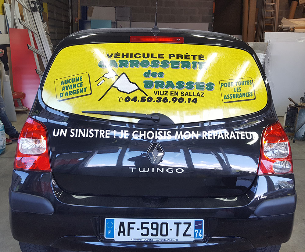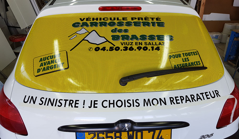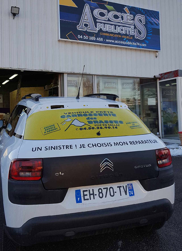 Réalisation d’un covering partiel pour les véhicules de prêt d’une carrosserie. Ce décor a été décliné sur toute la flotte de véhicules de l’entreprise. Décor réalisé par nos soins