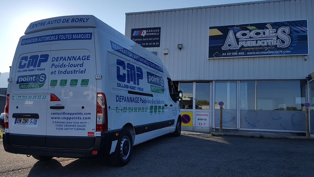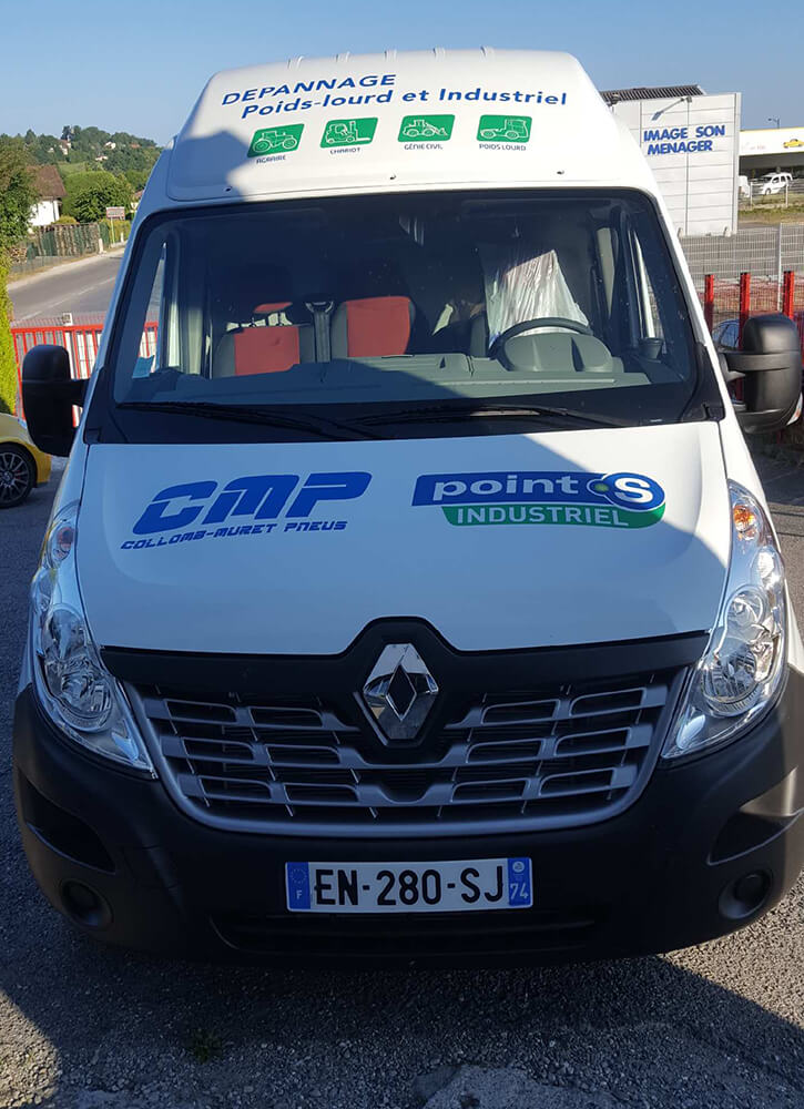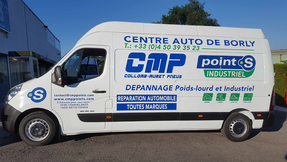 Réalisation d’un covering partiel pour le centre auto CMP – Point S spécialisé dans la vente de pneus et les réparations automobiles toutes marques. Ce décor a été décliné sur toute la flotte de véhicules de l’entreprise. Décor réalisé par nos soins.