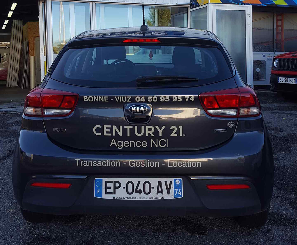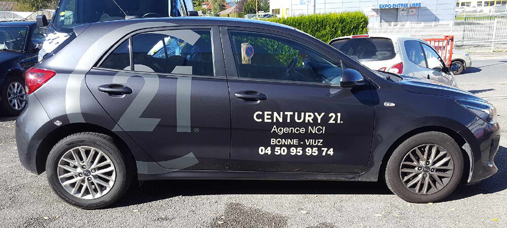 Réalisation d’un covering partiel pour les véhicules des agences immobilières Century 21 de Bonne & Viuz. Ce décor a été décliné sur toute la flotte de véhicules de l’entreprise. Décor fourni par le client