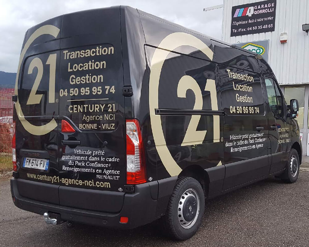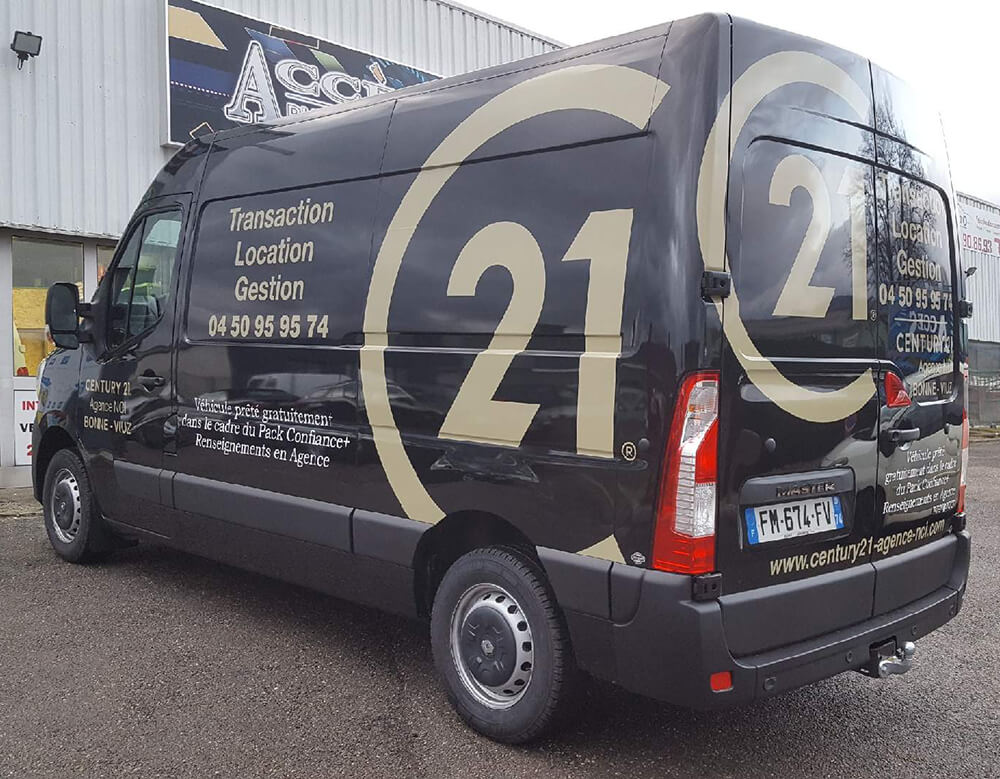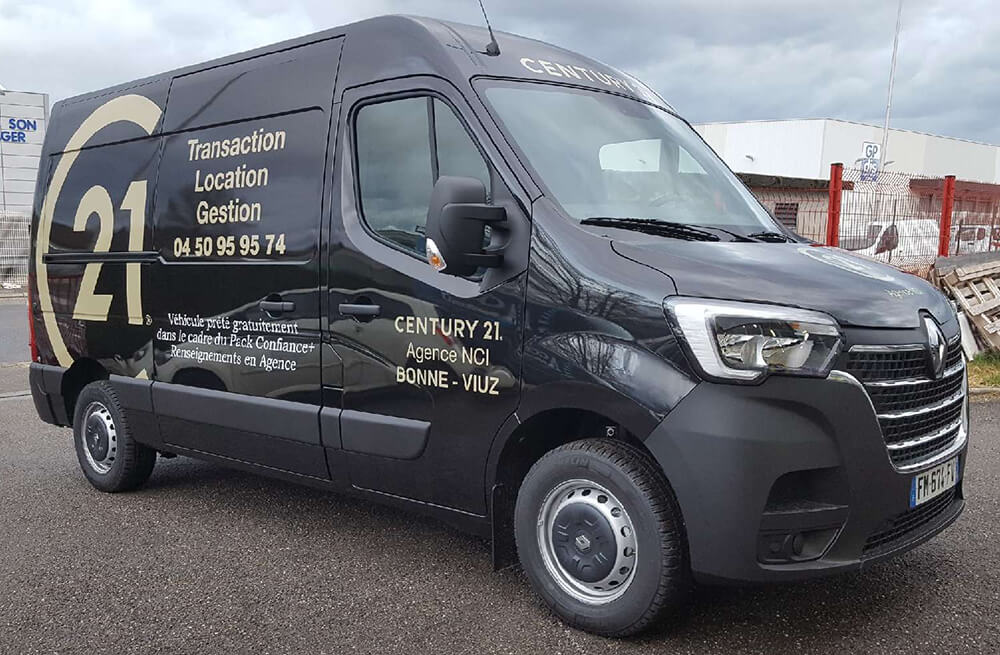 Réalisation d’un covering partiel sur le véhicule de cette agence immobilière avec application de la nouvelle charte graphique. Décor réalisé par nos soins.