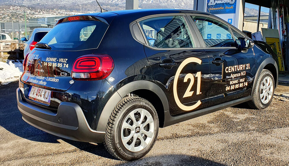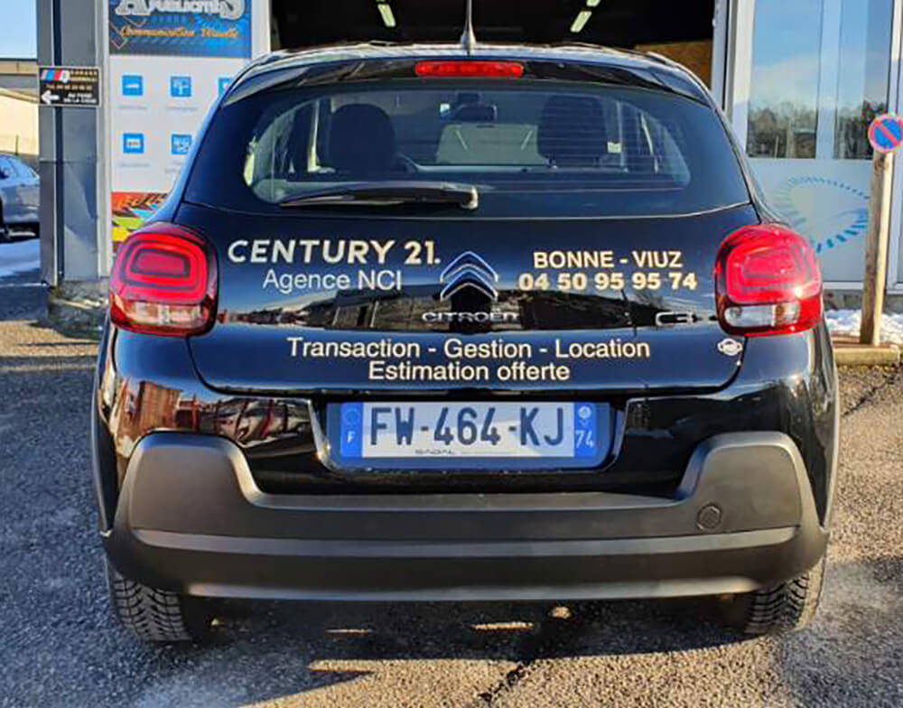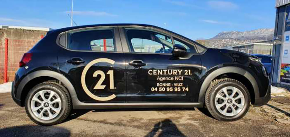 Réalisation d’un covering partiel sur le nouveau véhicule de cette agence immobilière installée à Bonne et Viuz-en-Sallaz. Décor réalisé par nos soins conformément à la charte graphique de l’entreprise et décliné sur toute la flotte de véhicules.