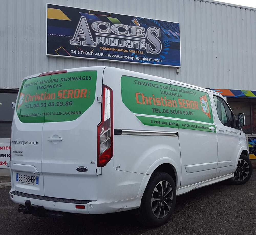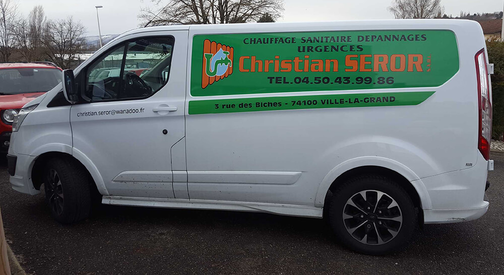 Réalisation d’un covering partiel pour un chauffagiste intervenant sur le secteur Annemassien. Décor réalisé par nos soins.