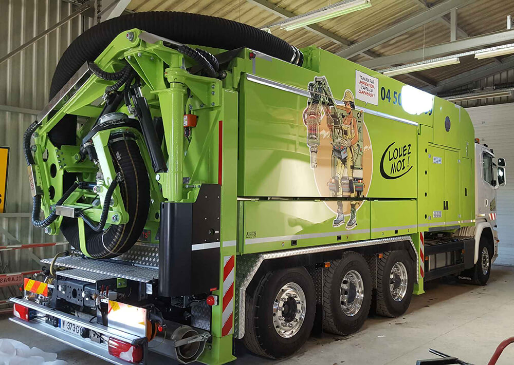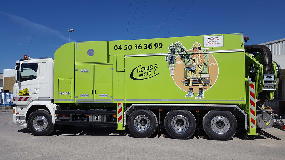 Réalisation d’un covering partiel XXL pour ce camion outil d’une société spécialisée dans les travaux publics. Fichiers fournis par le client.